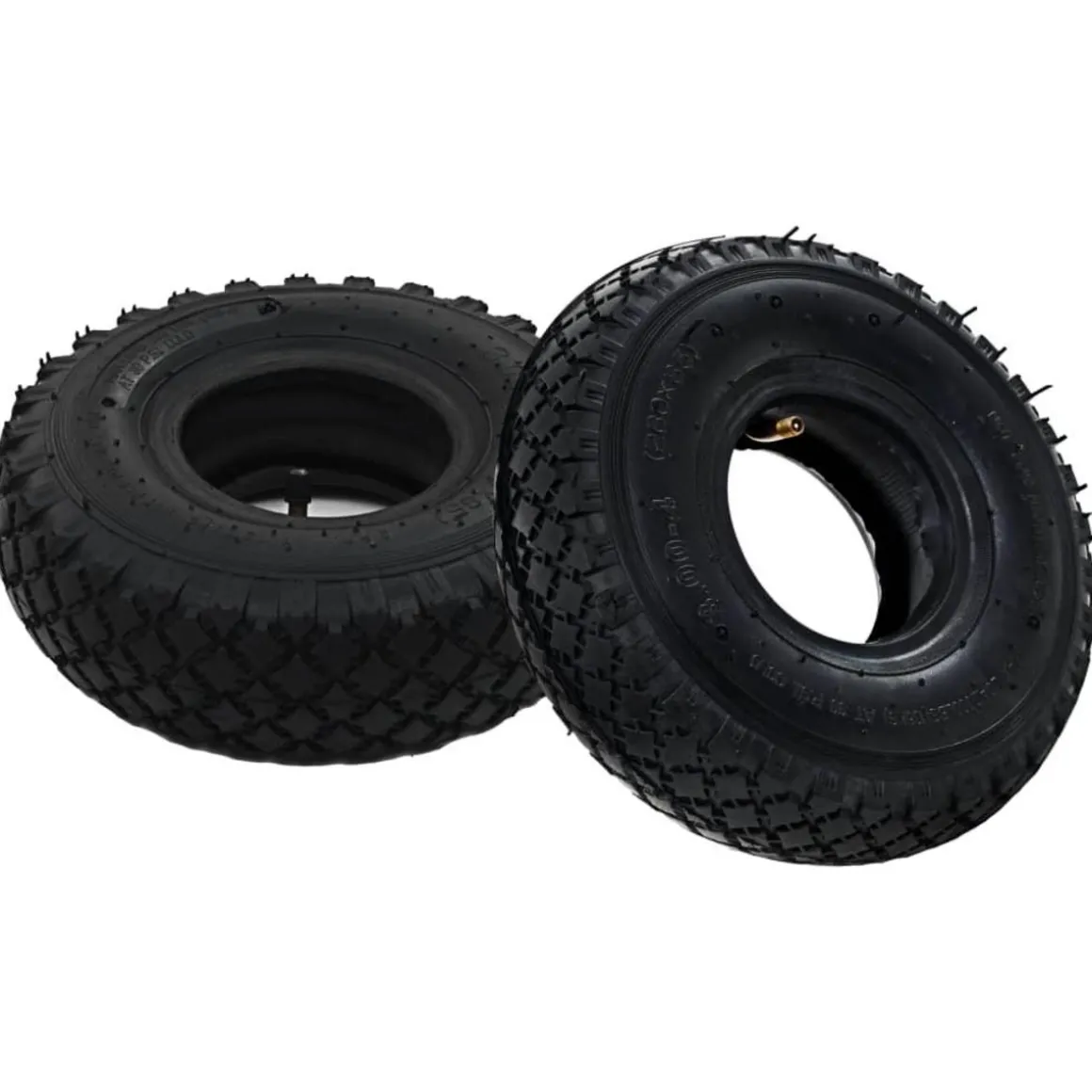 Les pneus et les chambres a air sont en caoutchouc resistant a l’abrasion et durable. Les pneus ont une conception de bande de roulement speciale qui offre une adherence accrue a grande vitesse. Les chambres a air aident a retenir la pression d’air et a prevenir les fuites d’air dans les pneus. L’ensemble de pneus et de chambres a air de rechange est parfait pour un usage residentiel, commercial et industriel, mais pas pour un usage sur la route.