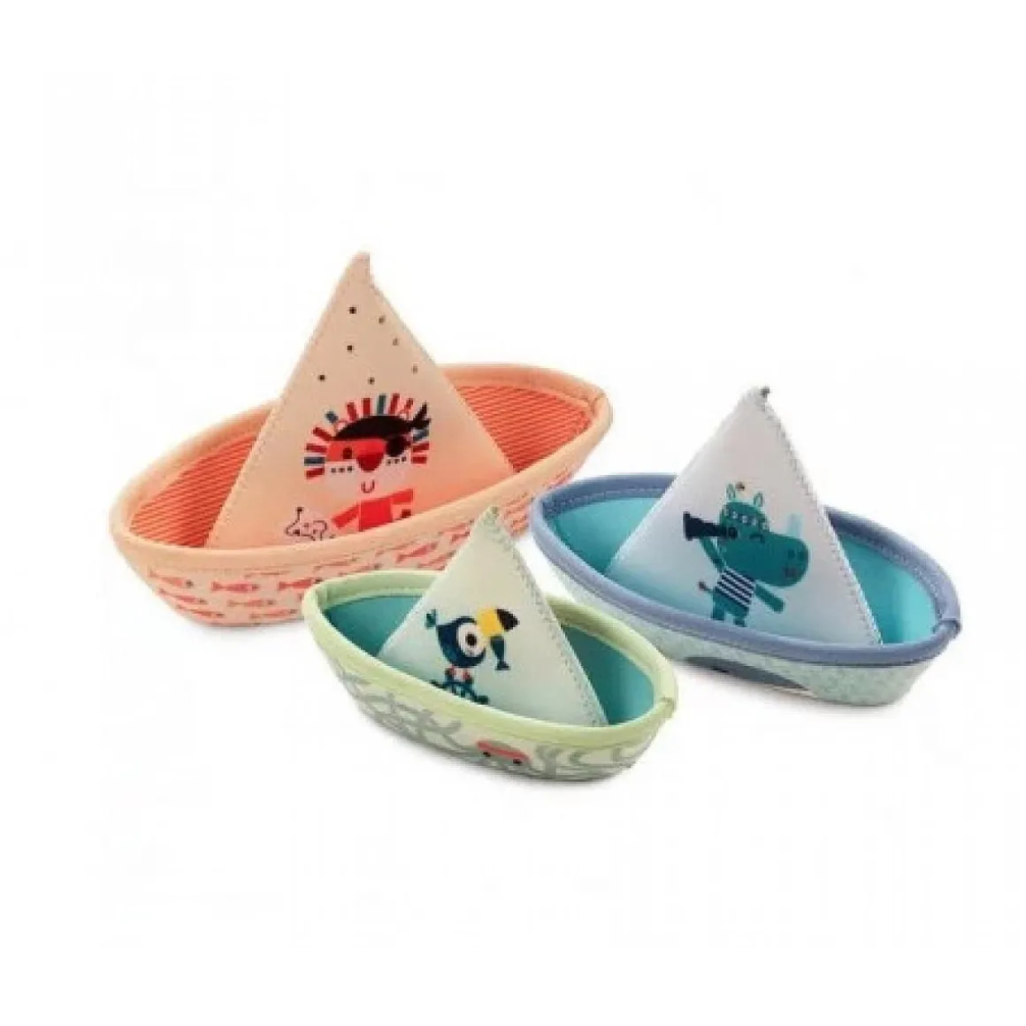 Trois petits bateaux flottants en Néoprène, Orange, Bleu et Vert, joliment illustrés sur le thème de la jungle, qui flottent pour amuser votre enfant dans la baignoire à l’heure du bain. Et qui sécheront vite sans risque de moisissure.