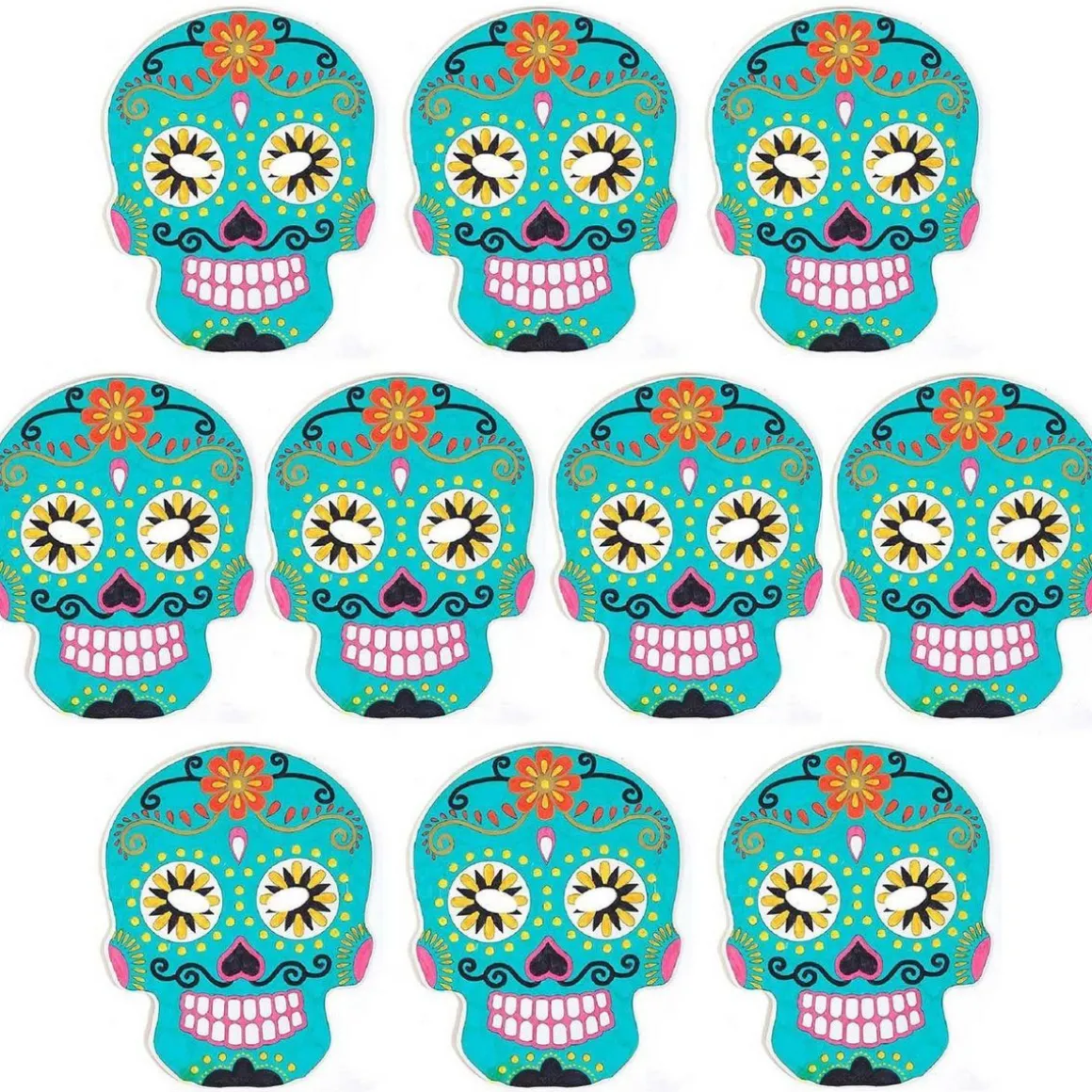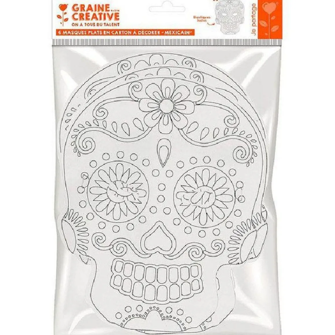 60 masques plats en carton tête mexicaine à décorer. Il suffit de colorier le masque, enfiler l’élastique et de vous amuser ! L’illustration coloriée est donnée à titre d’exemple. Il faut bien sûr colorier le masque en suivant les traits noirs.