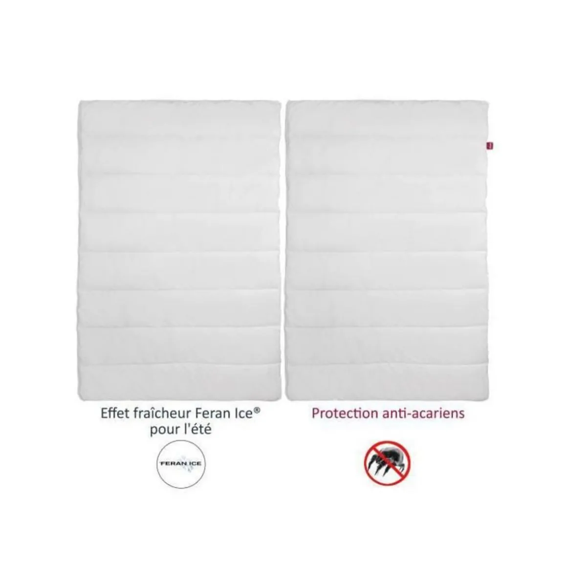 Couette 4 SAISONS Anti-Acariens 220x240cm – 1 couette légere (200g/m ) idéale pour l’été + 1 couette tempérée (300g/m ) idéale en mi-saison – Enveloppe : 100% Polyester FERAN ICE® pour la couette légere et 100% Polyester ACARISTOP® pour la couette tempérée – Piquage : ligne – Fabrication Française.