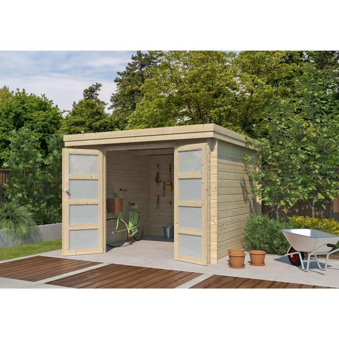 L’abri de jardin Apetina 295x295cm de Gardenas est fait en bois épicéa 28mm non traité. D’un design sobre et moderne, cet abri de jardin cubique est couvert d’une toiture métallique avec protection anti-condensation. Double porte avec plexi.