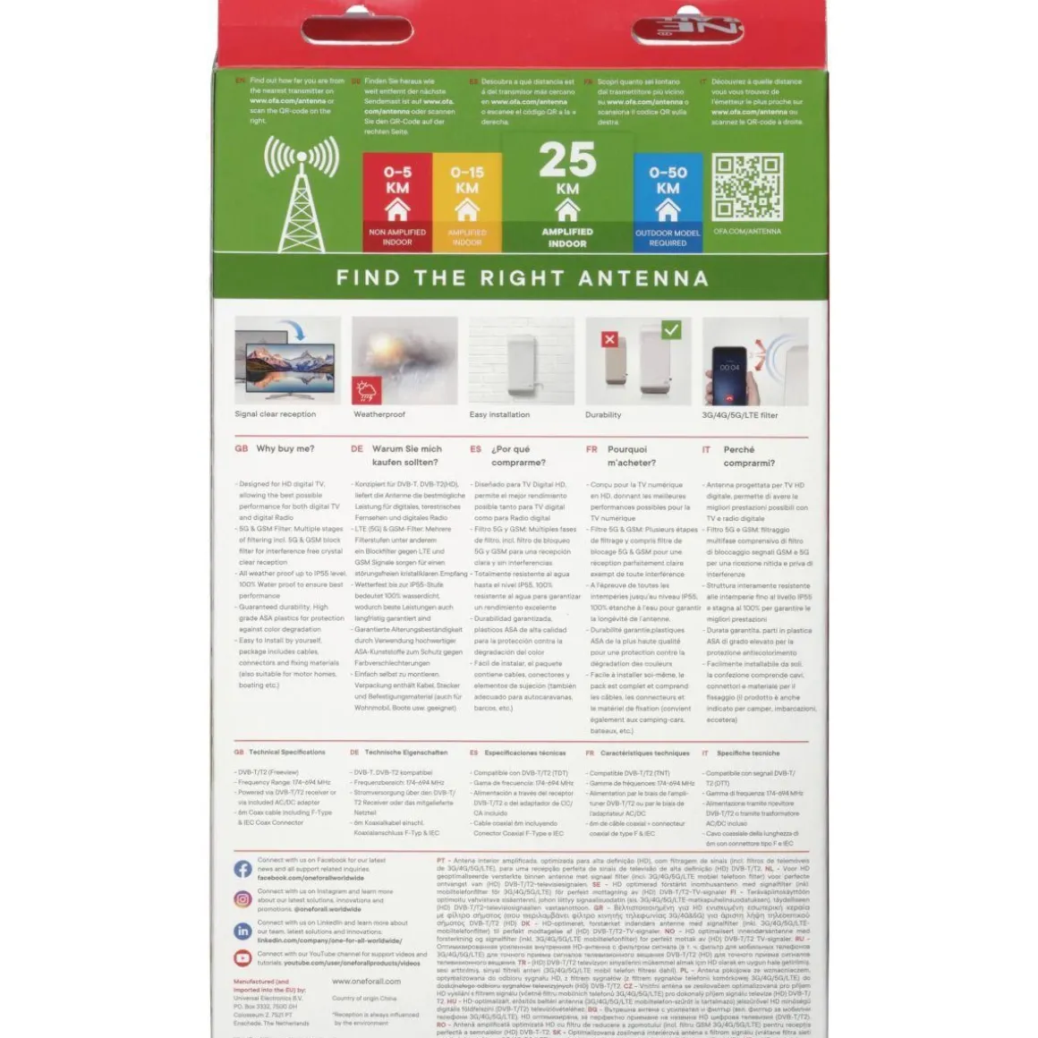 | Accessoire(s) supplémentaires(s) | Facile à installer par l’utilisateur, la boîte contient les câbles, connecteurs et matériaux de fixation. Câble coaxial 6m. | |
