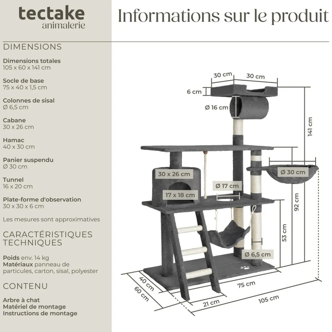- Cabane à chat (ØxH) : environ 30 cm x 26 cm – Ouverture (lxH) : 17 cm x 18 cm.