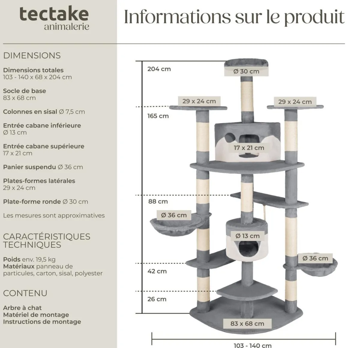 - Matériaux : Panneaux de fibres (MDF) / Sisal / Tunnel en carton / Peluche.