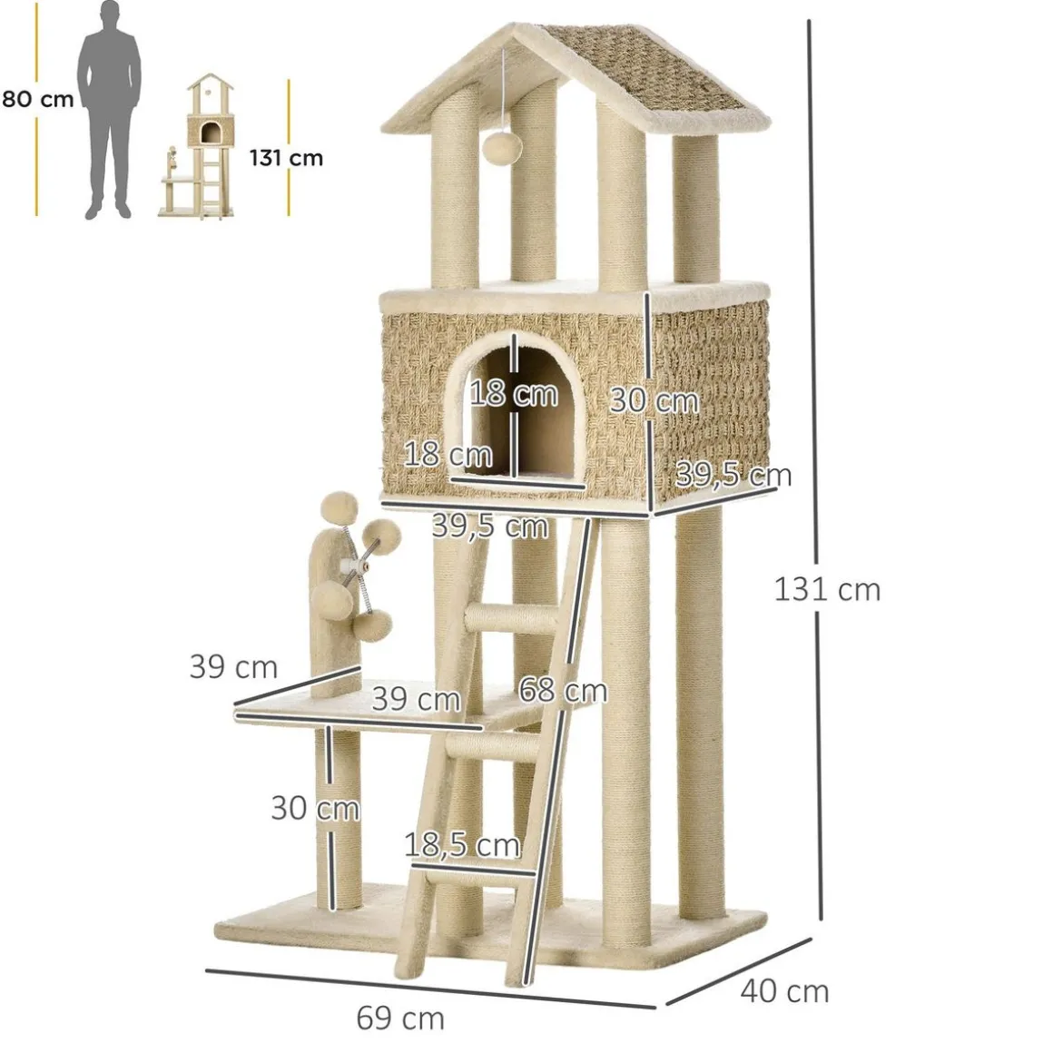 – Arbre à chat centre d’activités variées : griffoirs, grande niche, échelle, plateformes (dont une d’observation avec toit), jeu de boules tourniquet permettant à votre chat de jouer, faire ses griffes et de s’étirer