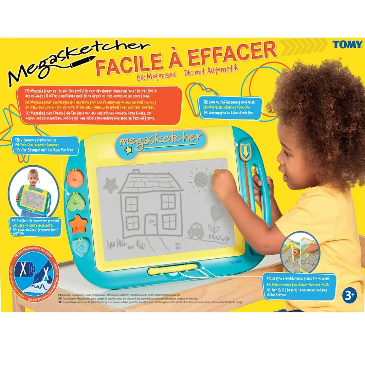 Cette planche a dessin magnetique Megasketcher de la marque TOMY est parfaite pour divertir votre enfant lors de longs voyages en voiture et aussi a la maison. Ils ne necessitent pas de piles, d’encre ou de papier car ils peuvent dessiner leurs images preferees encore et encore.