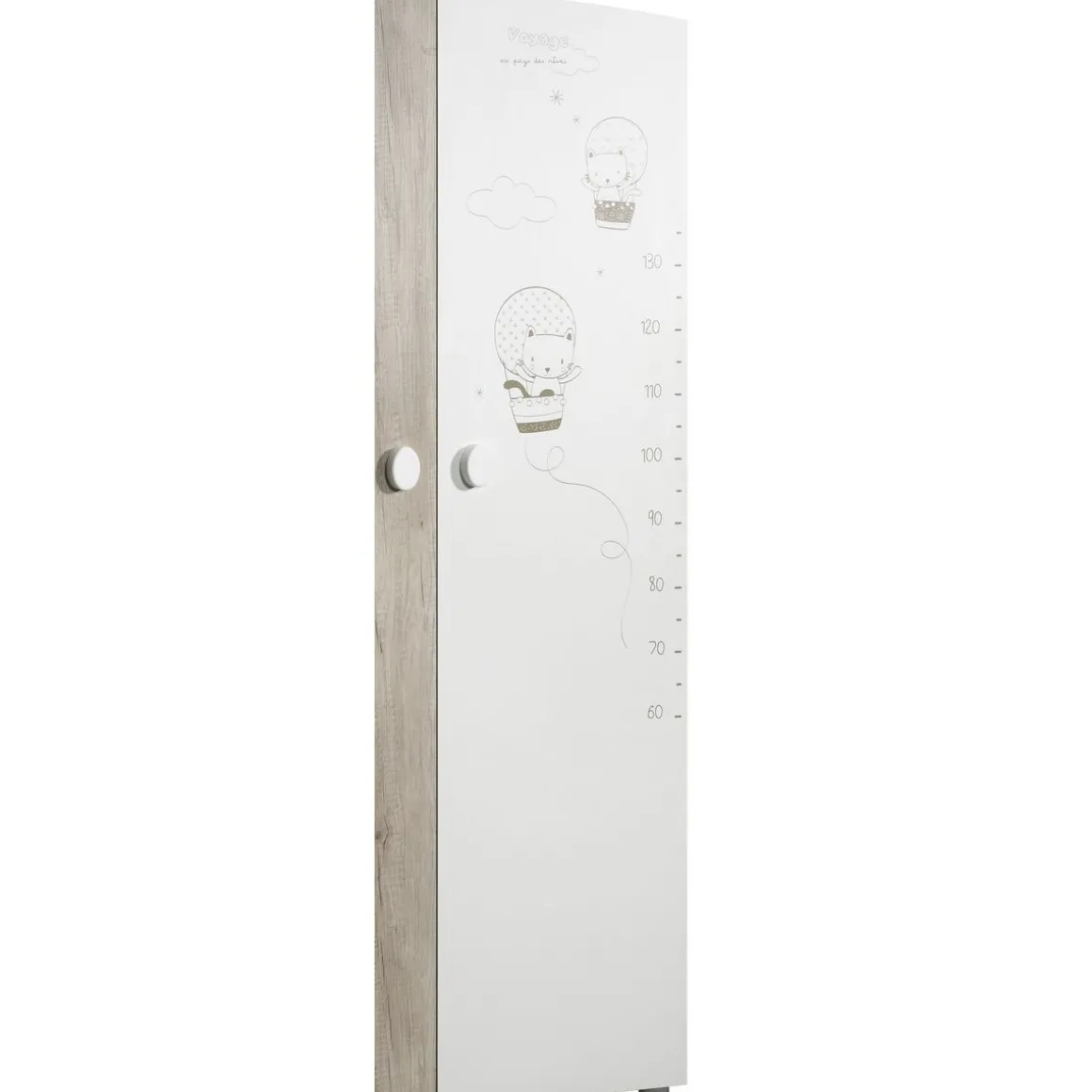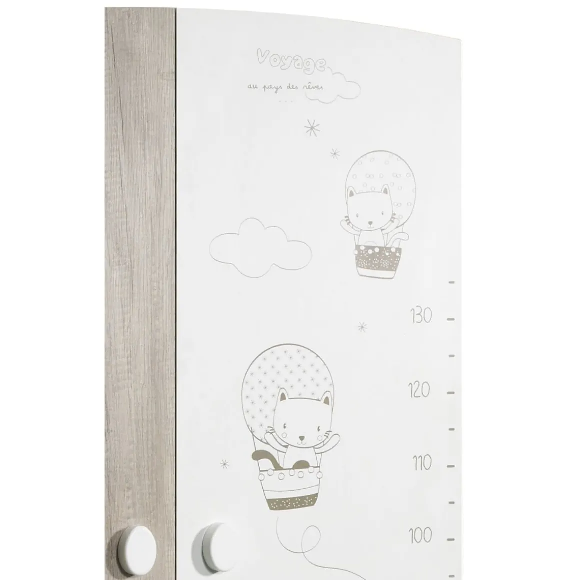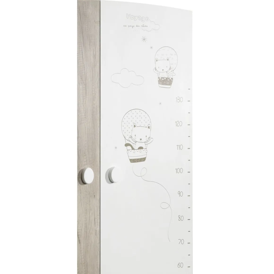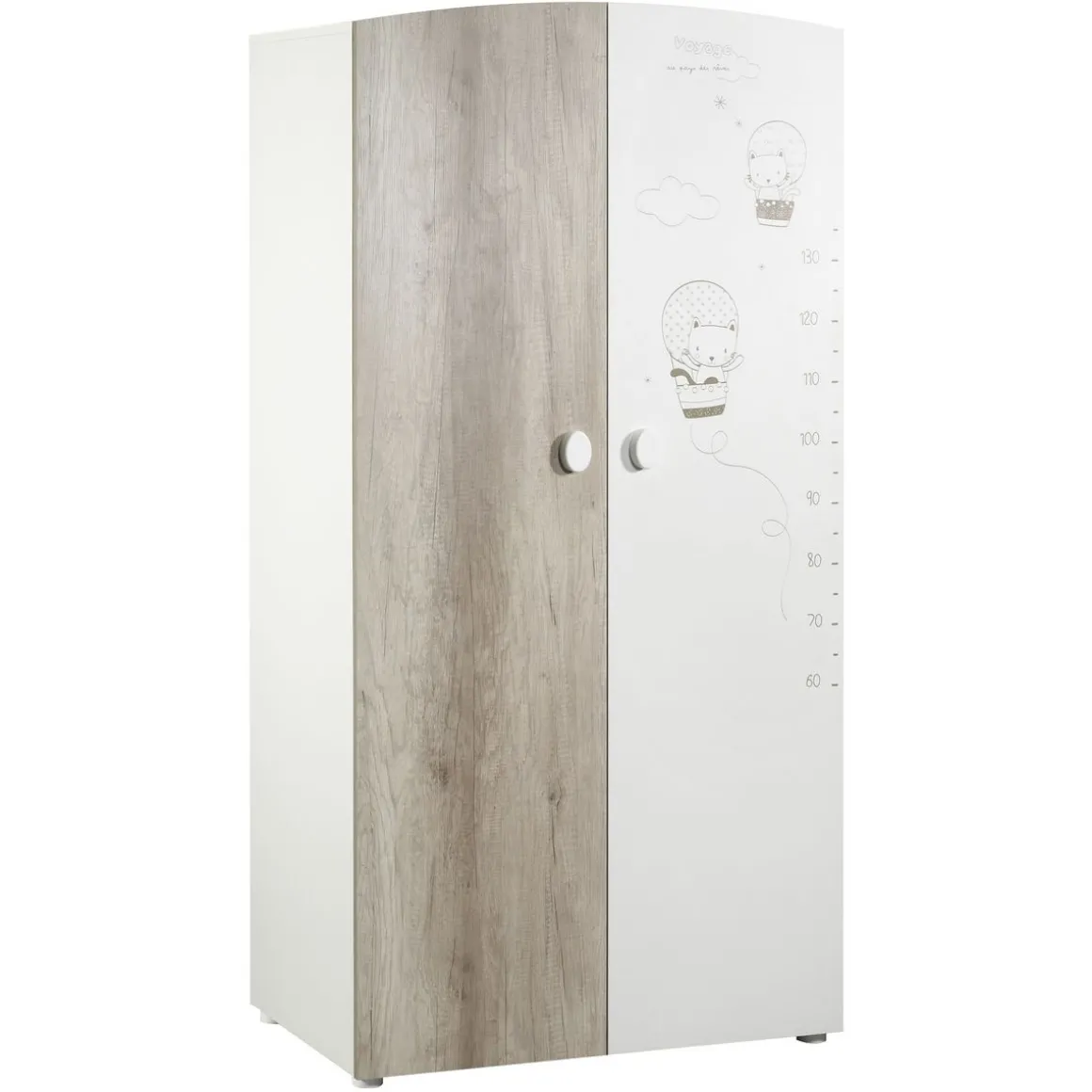 Joli armoire 2 portes de coloris décor chêne et mélaminé blanc avec motifs. Le petit plus, une sérigraphie sur la porte de droite pour mesurer votre petit bout et voir son évolution dans le temps ! Aménagée d’une penderie et de 3 tablettes elle est parfaite pour ranger toutes les affaires de bébé. Poignées ovales blanches. 4 pieds ronds blancs. Structure en panneaux de particules. Fabrication française.