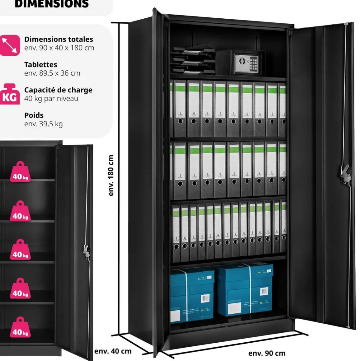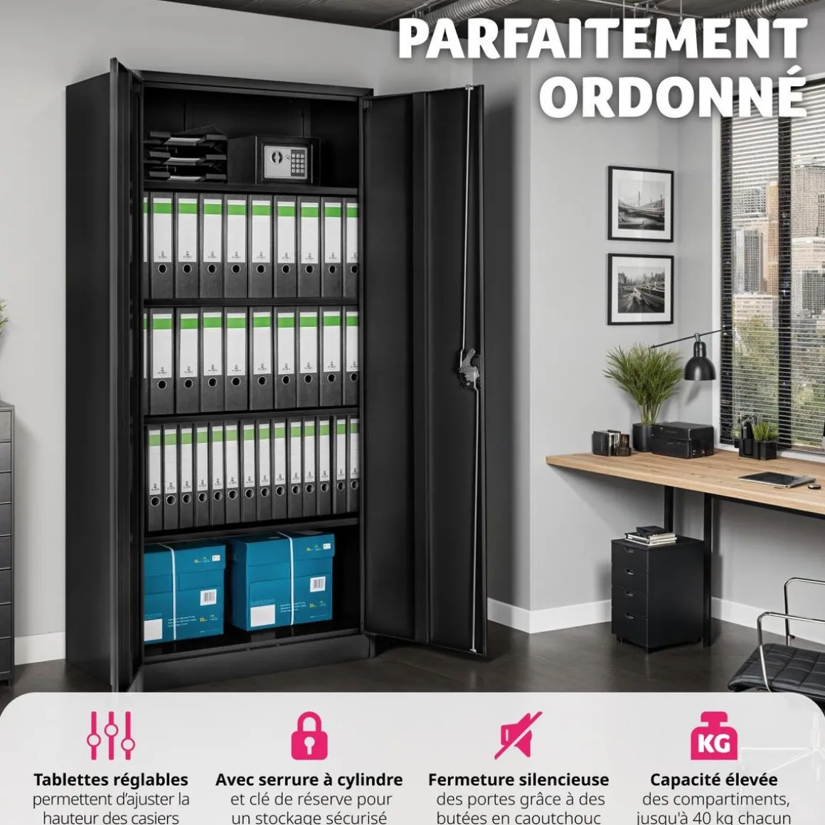 Avec ses 4 étagères réglables en hauteur, cette armoire métallique s’adapte parfaitement à vos besoins de rangement. Les étagères sont capables de supporter jusqu’à 40 kilogrammes chacune, offrant ainsi une solution robuste pour vos alteurs et autres fournitures de bureau. Que vous ayez besoin de stocker des valises ou des sacs, cette armoire est conçue pour accueillir des objets de grande taille grâce à sa hauteur d’environ 180 centimètres.