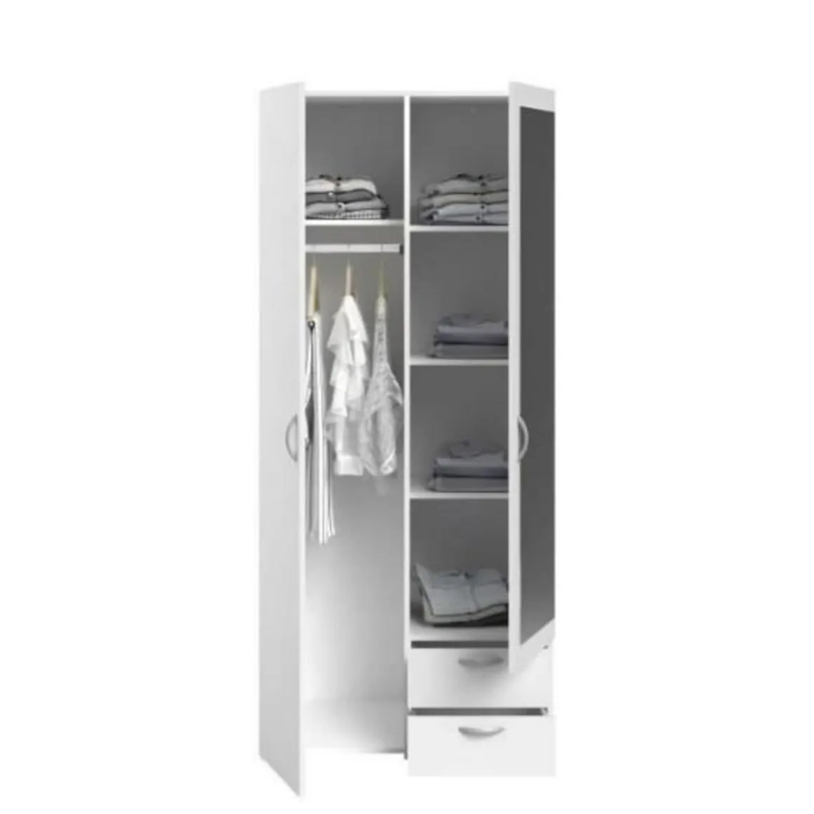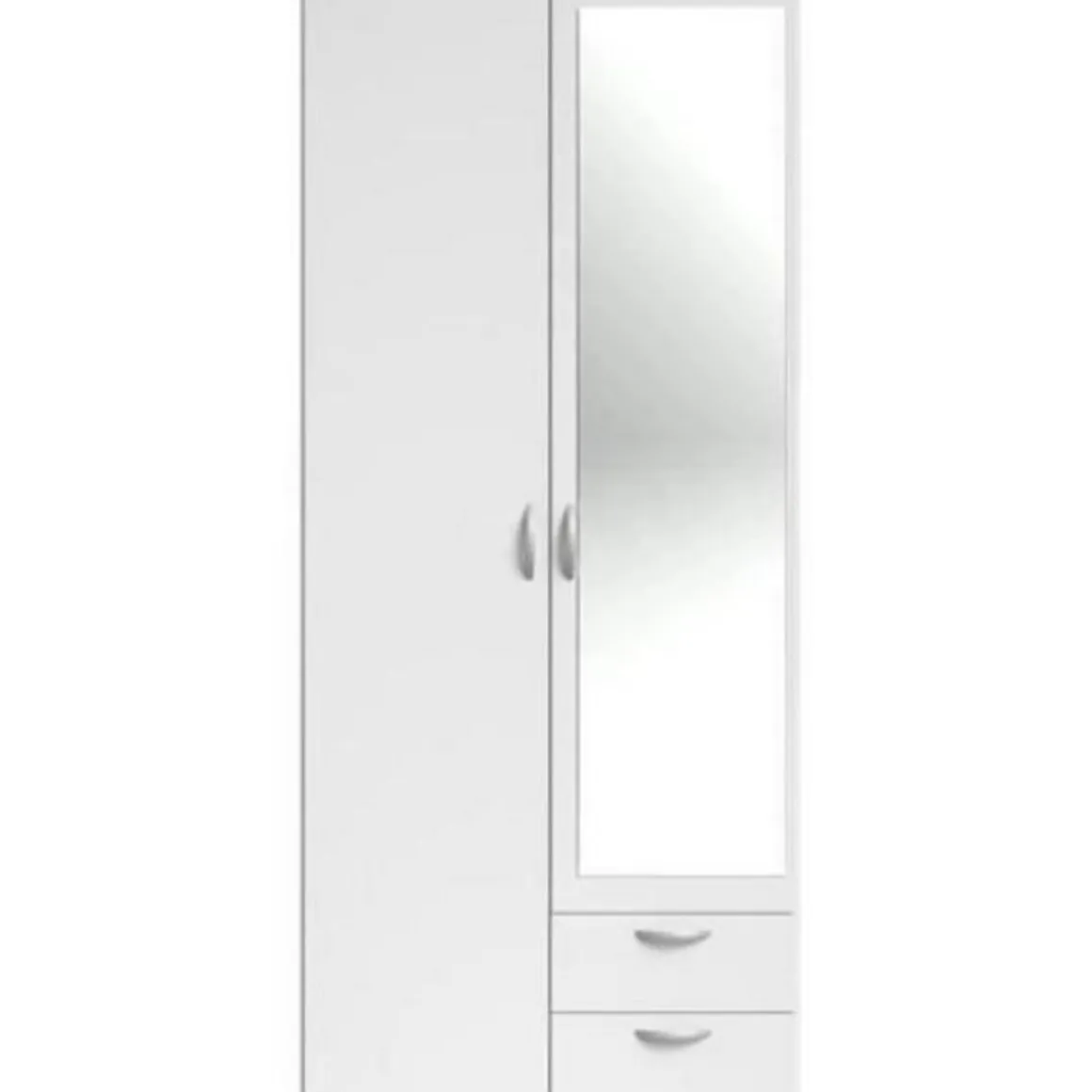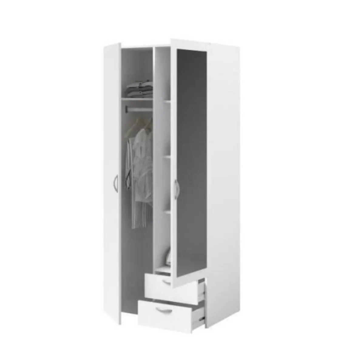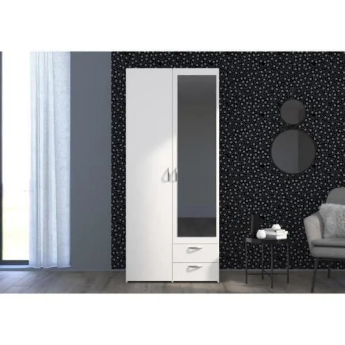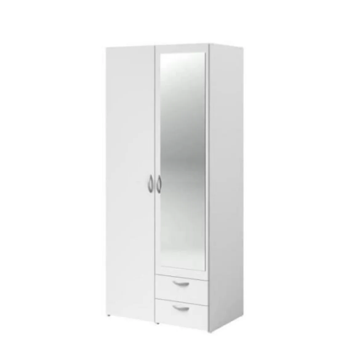 PARISOT Armoire 2 portes battantes dont 1 miroir + 2 tiroirs – Aménagement intérieur : Moitié penderie avec 1 tringle + 1 tablette supérieure et moitié lingere avec 3 rayons – Panneaux de particules revetus de papier décor blanc – Dimensions : L 81 x P 51,5 x H 185,5 cm – VARIA