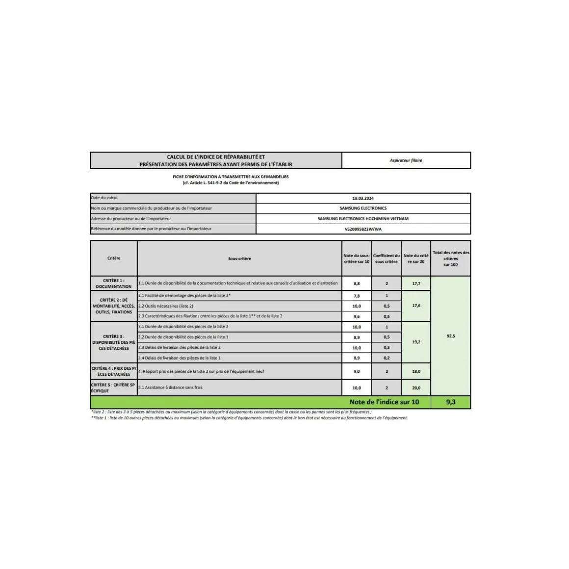 Puissance aspiration (Airwatts) : 210 (mode Jet).