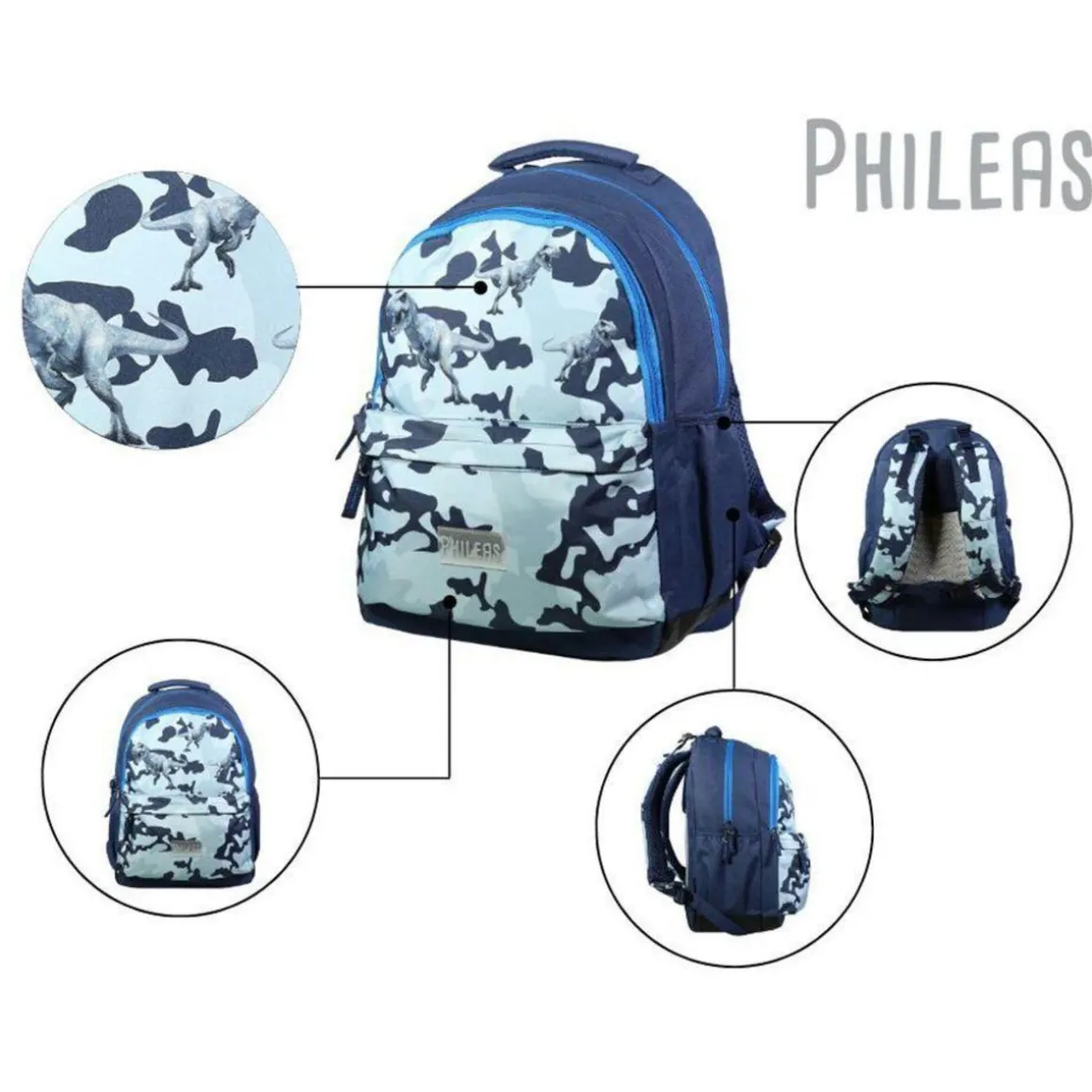 Le sac à dos 2 compartiments Phileas est très innovant grâce à son système Smart Comfort qui le rend si unique. Son design ergonomique est inspiré des sacs de randonnée pour en faire le PLUS CONFORTABLE DES SACS A DOS ! Ce design dinosaures et camouflage est tendance et intemporel. Ce grand sac avec ses 2 compartiments et sa poche avant permettra à votre enfant d’y ranger sans problème toutes ses fournitures scolaires. Il pourra glisser sa bouteille dans la poche côté qui est adaptée. Ses dimensions de 29,5cm de long, 19cm de large et 40cm de haut sont adaptées pour les altes de primaire et de collège. Coloris bleu. 100% polyester. Le dos moulé en mousse EVA permet au sac d’épouser parfaitement le dos de l’enfant en allégeant la pression sur la colonne vertébrale. La mousse haute densité en demi-lune permet de protéger le bas du dos. Les bretelles ergonomiques enveloppent la partie avant des épaules avec une mousse ultra confort. Des sangles de rappel de charge permettent le réglage en hauteur, le tout pour une meilleure répartition du poids sur les épaules et un portage au plus près du dos garantissant une très bonne stabilité. Pour garantir la sécurité de votre enfant, ce sac à dos est équipé de bandes réfléchissantes. Soyez certain que ce modèle robuste garanti 10 mois ne vous décevra pas.