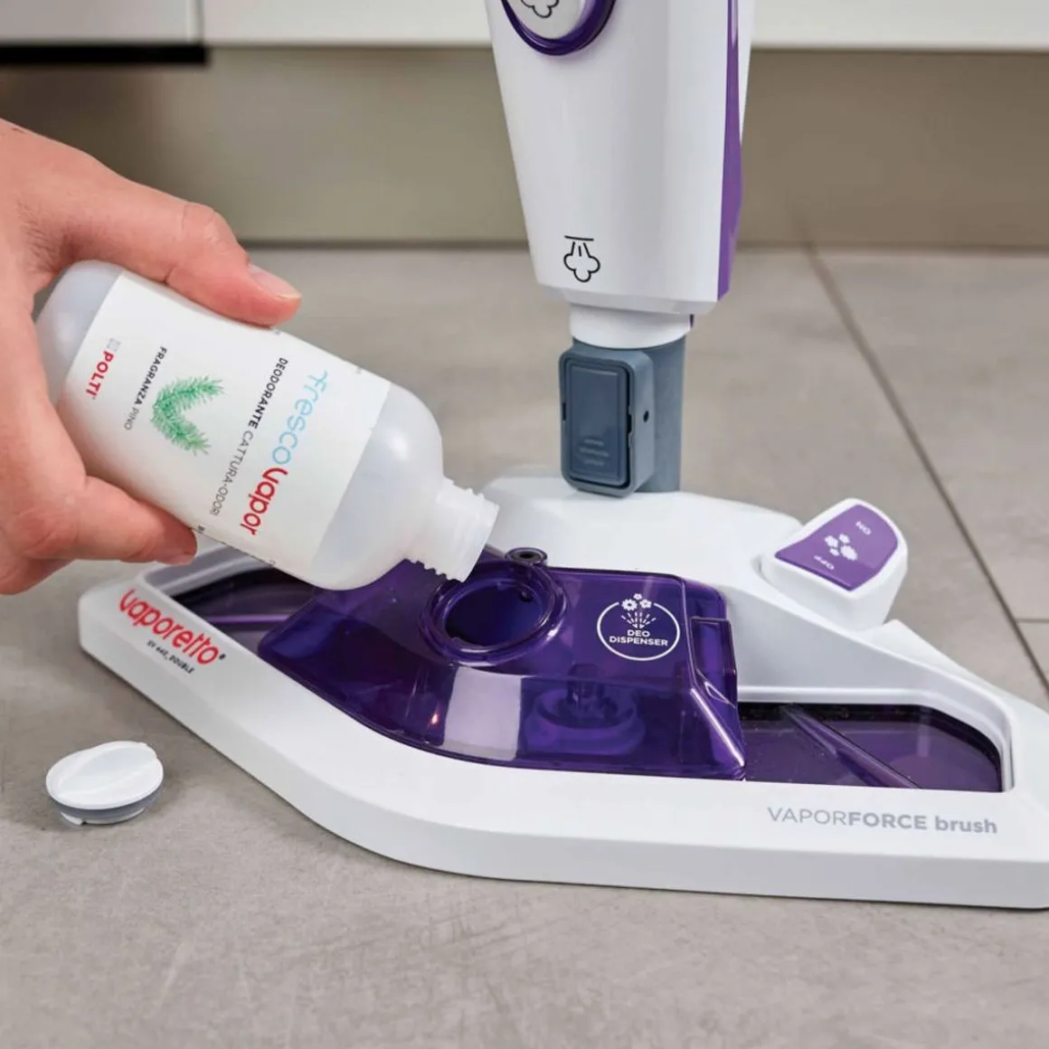 Il est équipé de nombreux accessoires dont une brosse spéciale joints, d’un adaptateur pour tapis et moquette pour faciliter le nettoyage selon les surfaces, et de deux serpillières microfibre. Un diffuseur de parfum est intégré dans la brosse.