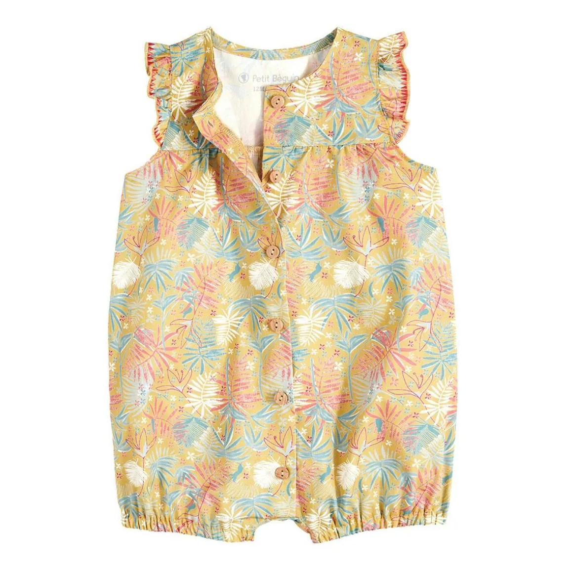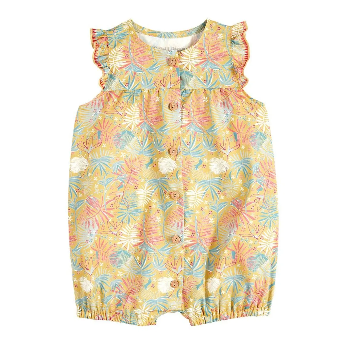 Barboteuse un jour, barboteuse toujours ! Notre pièce phare de l’été se présente cette fois-ci dans un joli coloris ocre et de beaux feuillages. On adore les petits froufrous aux épaules et les boutons sur toute la face avant. De superbes volants sur les épaules Une ouverture complète avec des pressions sur le devant
