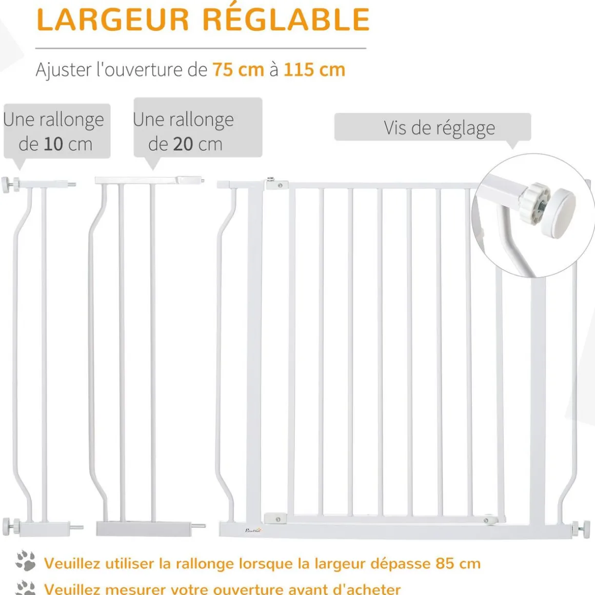 – Avec rallonge et vis de réglage pour s’adapter à l’ouverture de 75 cm à 115 cm,