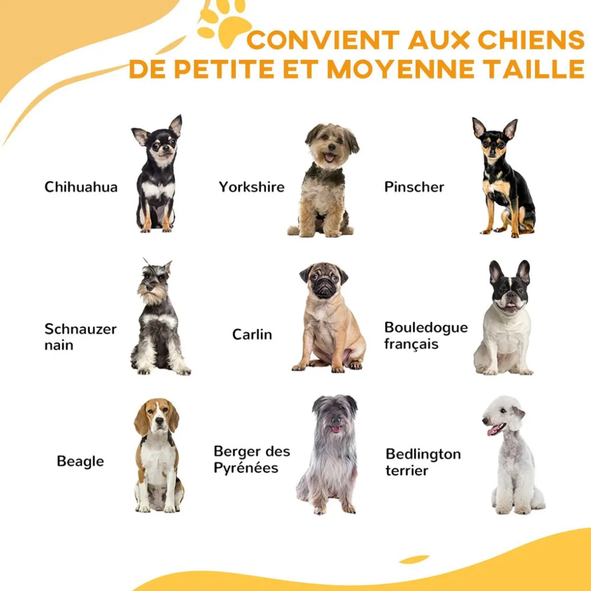 – Conçu pour les chiens de petite et moyenne taille, avec une hauteur d’épaule de 25 à 50 cm