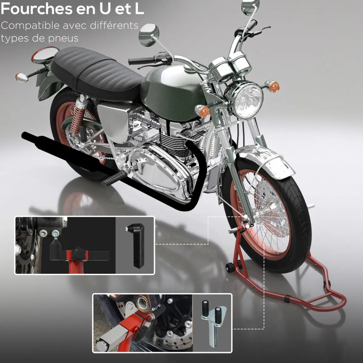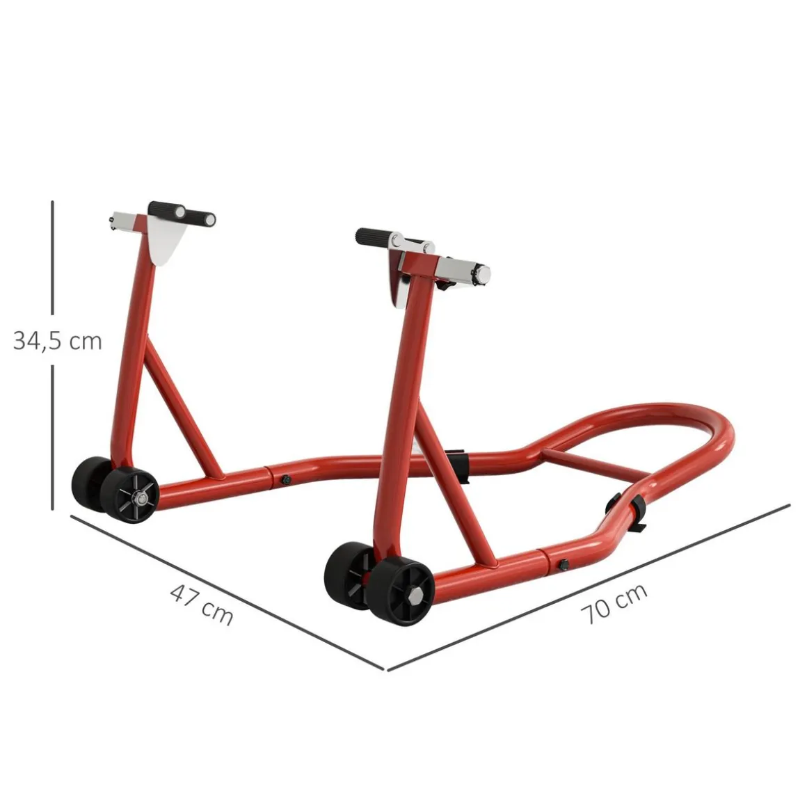 Optimisez l’entretien de votre moto avec le support HOMCOM, parfait pour divers types de pneus. Il assure un ajustement optimal avec ses adaptateurs et revêtements antidérapants, et un cadre en acier robuste pour un soutien résistant. Un outil indispensable pour lever facilement votre moto.