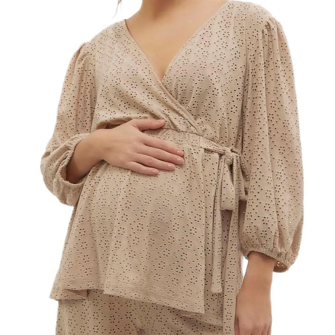 Découvrez la blouse de maternité de la marque MAMALICIOUSColoris : BeigeManches longuesCol VNoué à la tailleBlouse ajouréeComposition : 55% Viscose 45% Polyester