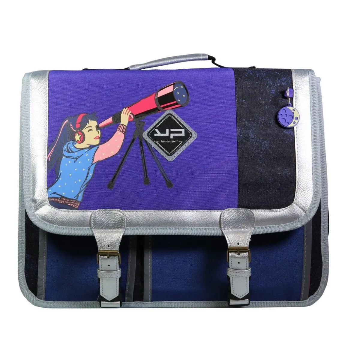 L’année scolaire promet d’être studieuse pour votre enfant. Ce cartable 41 cm Emma Étoile conviendra parfaitement aux altes de primaire.Dans un souci d’éco-responsabilité, les produits Bodypack sont conçus en tissu recyclé. Bien qu’il soit léger grâce à sa matière, ce cartable dispose d’un fond renforcé. Laissons à nos enfants une planète en bonne santé ! Ce cartable mesure 35 cm de haut, 41 cm de long et 14 cm de large, pour un poids de 930 grammes. Hyper ergonomique, il dispose de 2 grands compartiments avec une fermeture boucle, d’une poche séparation zippée, de 2 poches avant ainsi que d’une poche bouteille. La poche porte-règle permettra à vos enfant de ranger toutes ses petites fournitures scolaires.Pour un maximum de confort, le dos et les bretelles sont moussées. Également réglables, ces bretelles disposent de bandes réfléchissantes pour garantir une sécurité maximale sur le chemin de l’école. Retrouvez Emma observant les étoiles à l’aide de son camescope géant sur ce cartable bleu nuit garanti 2 ans. Phosphorescent, vous apercevrez quelques petites étoiles brillantes dans le noir