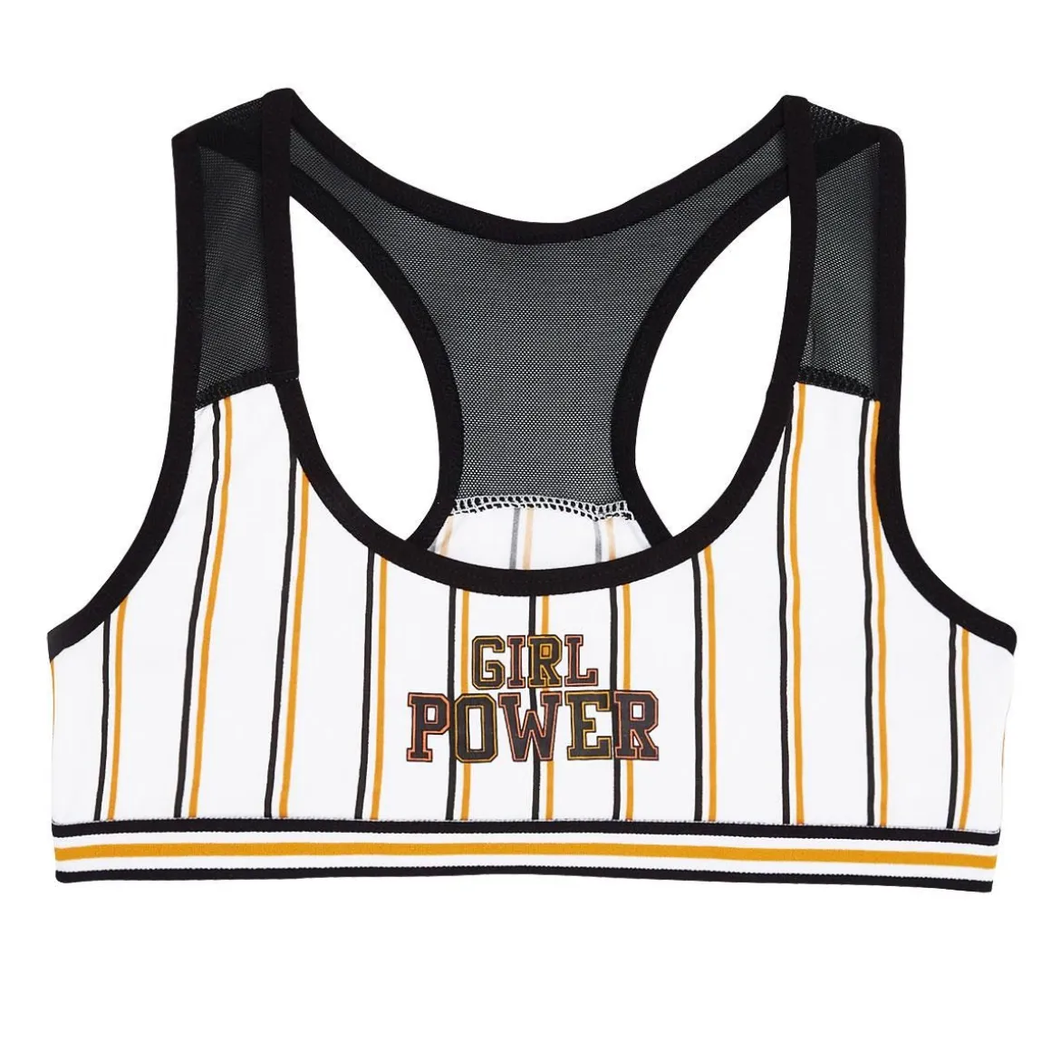 GIRL POWER : Notre best de la saison ! On adore l’imprimé rayures de cette brassière ainsi que sa forme et son look sportswear. Le petit + tendance ? Le tulle sur les épaules et dans le dos. Un élastique trop stylé ! Un jeu de transparence au dos