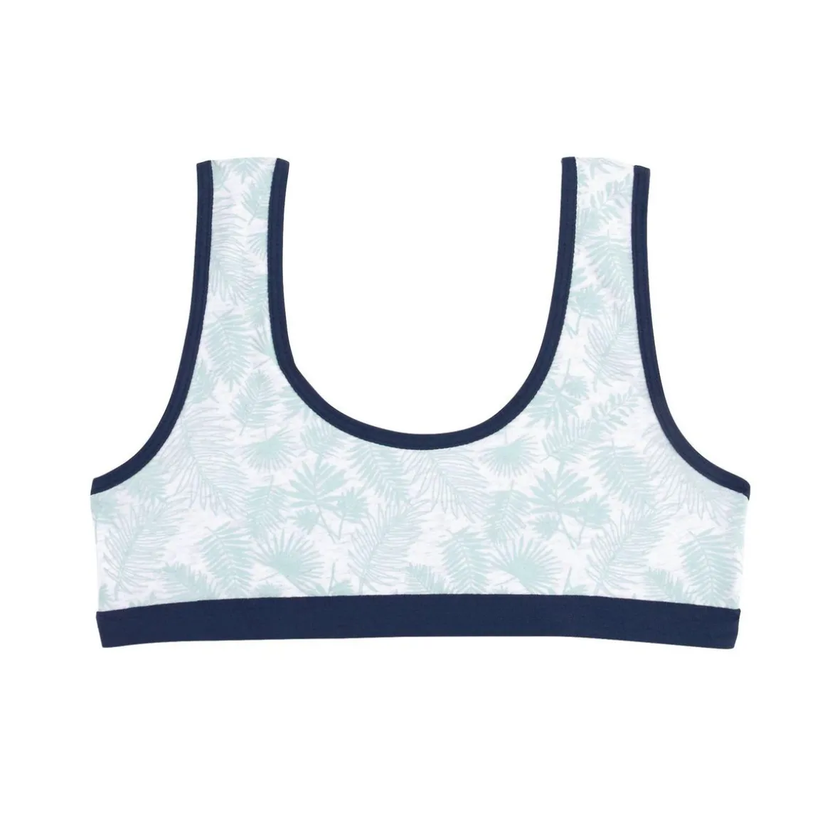 Vous allez adorer cette jolie brassière aux couleurs bleues, grises et écrues sur un imprimé tropical : de quoi nous donner chaud au coeur. Sans oublier le joli lot de 3 culottes associées à la brassière ! Contient 95% de coton issu de l’agriculture biologique