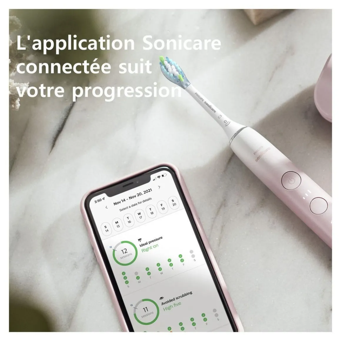 | Connecté(e) | oui, vous permet de suivre au quotidien la performance et l’évolution du brossage, et vous apporte des conseils | |