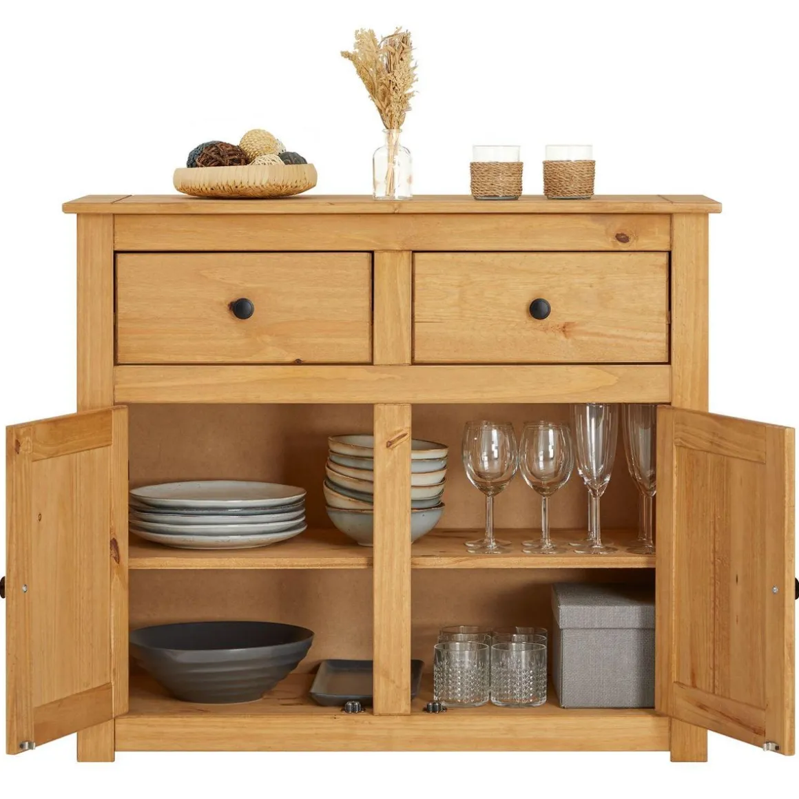 … apportera un côté chaleureux et élégant à votre décoration, que ce soit dans votre salon, votre cuisine ou votre salle à manger. Vous pourrez facilemEnt y ranger toutes vos assiettes et plats derrière les 2 grandes portes battantes. De plus les 2 tiroirs seront parfait pour accueillir vos couverts, du linge de maison ou tout autres objets. Avec sa structure En Pin massif au style maison de campagne, ce meuble de rangemEnt se mariera parfaitemEnt avec les reste de votre mobilier.
