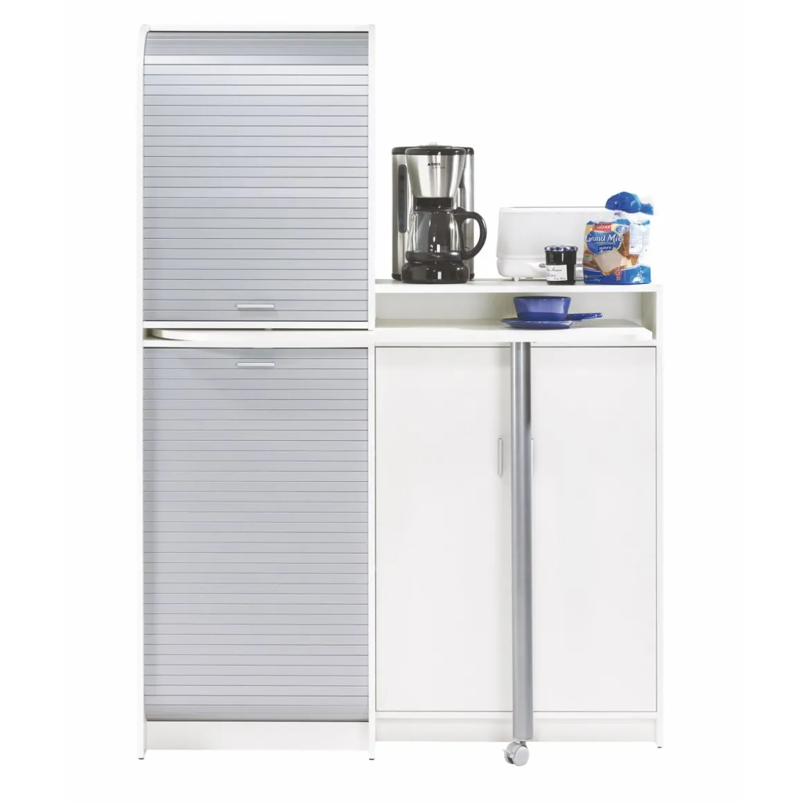 Colonne de rangement fermée par 2 rideaux en panneaux de fibres de moyenne densité recouverts d’un papier décor finition métal, équipée d’une poignée.