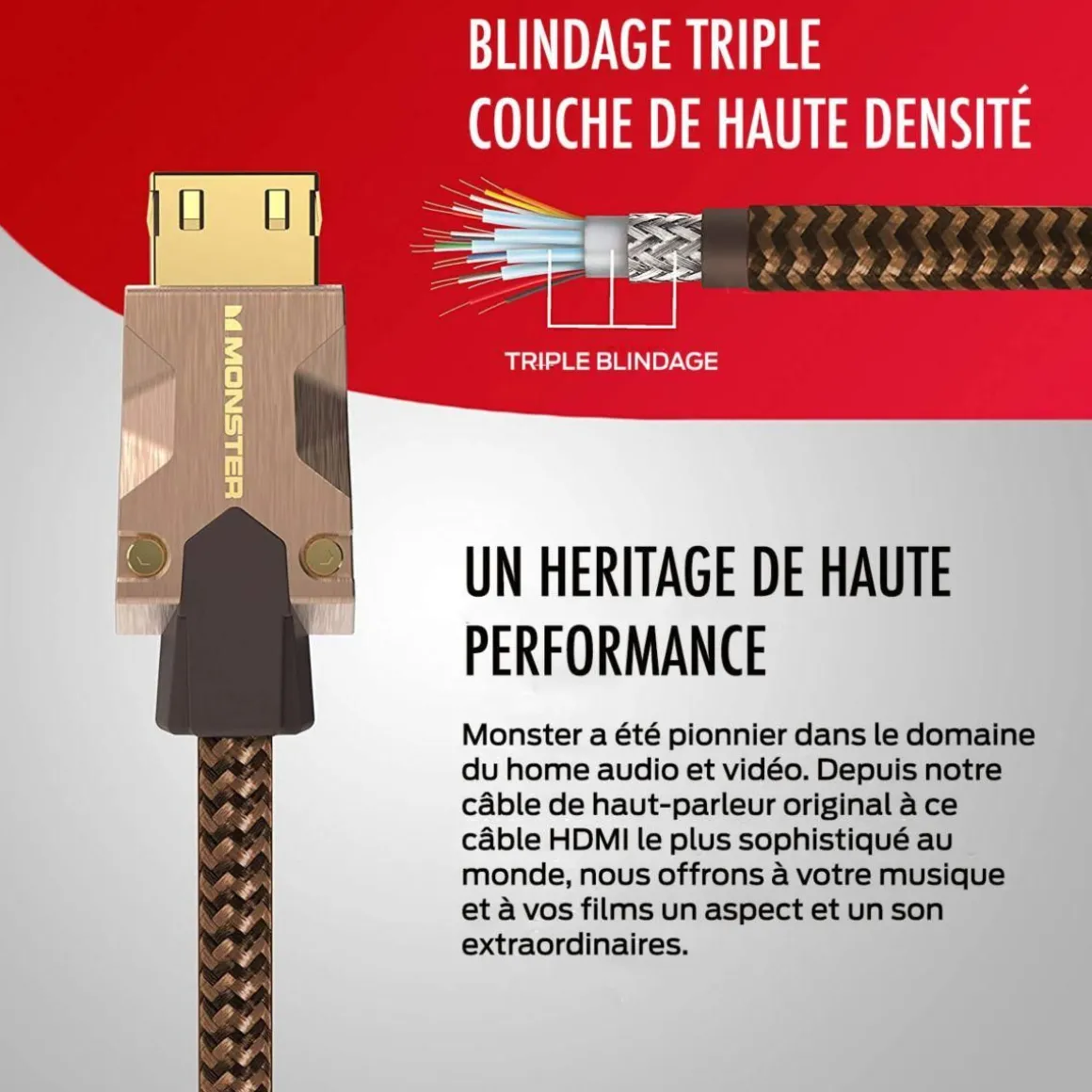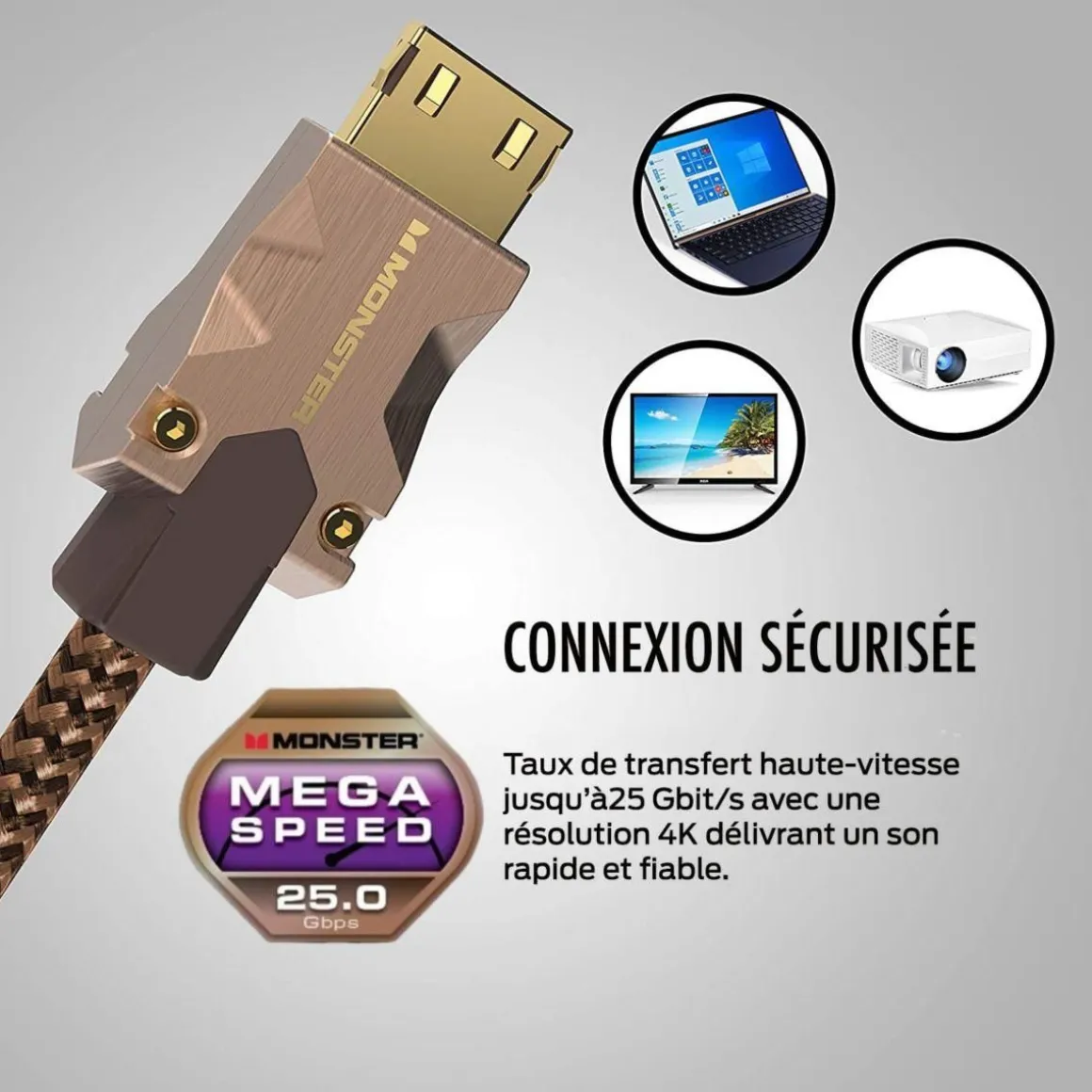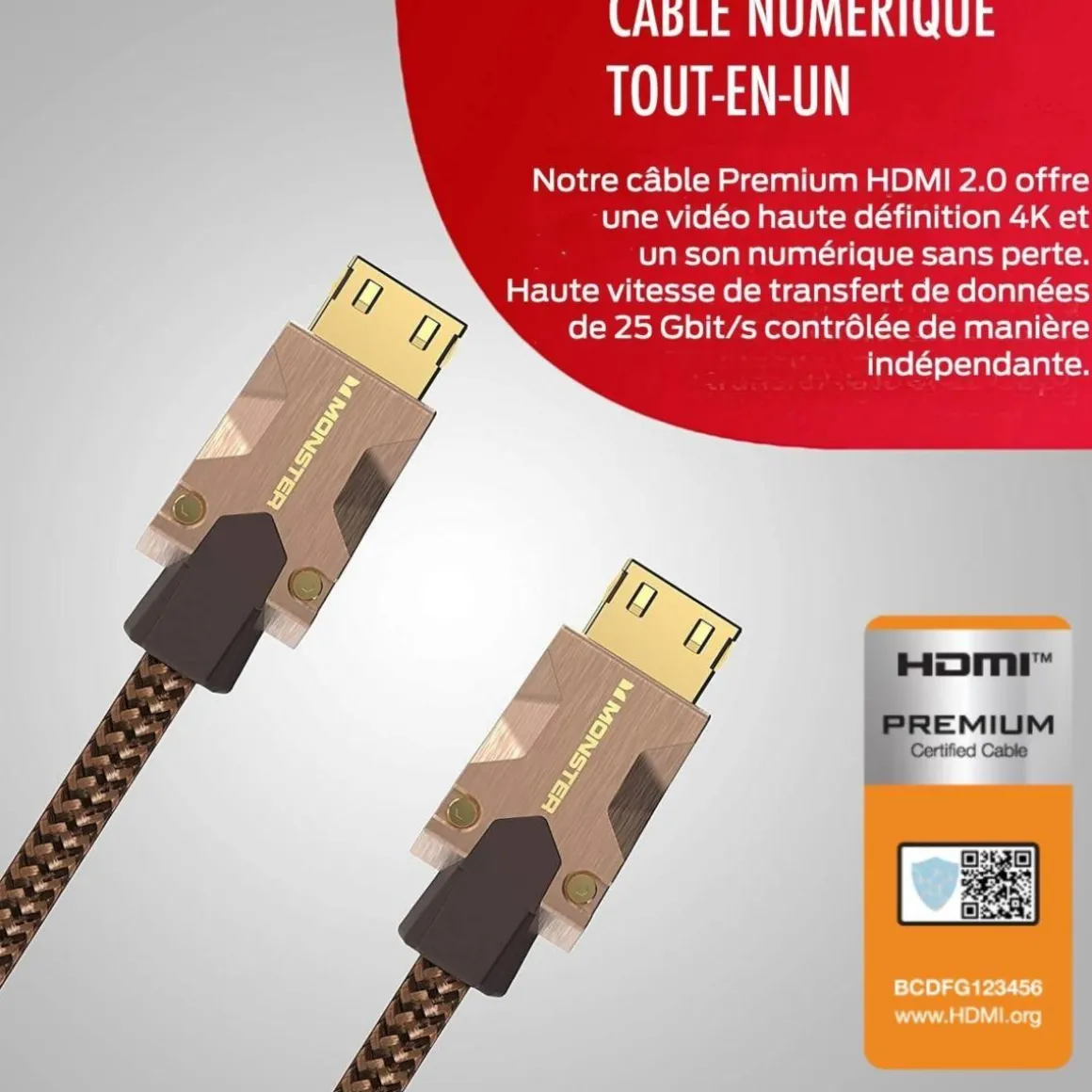 | Avantages | Le câble Monster HDMI 2.0 offre des résolutions ultra haute définition 4K à des taux de rafraîchissement impressionnants de 60 Hz et un rapport de couleurs de 10 bits pour une image en HDR10+ et une qualité audio immersives par le canal ARC | |