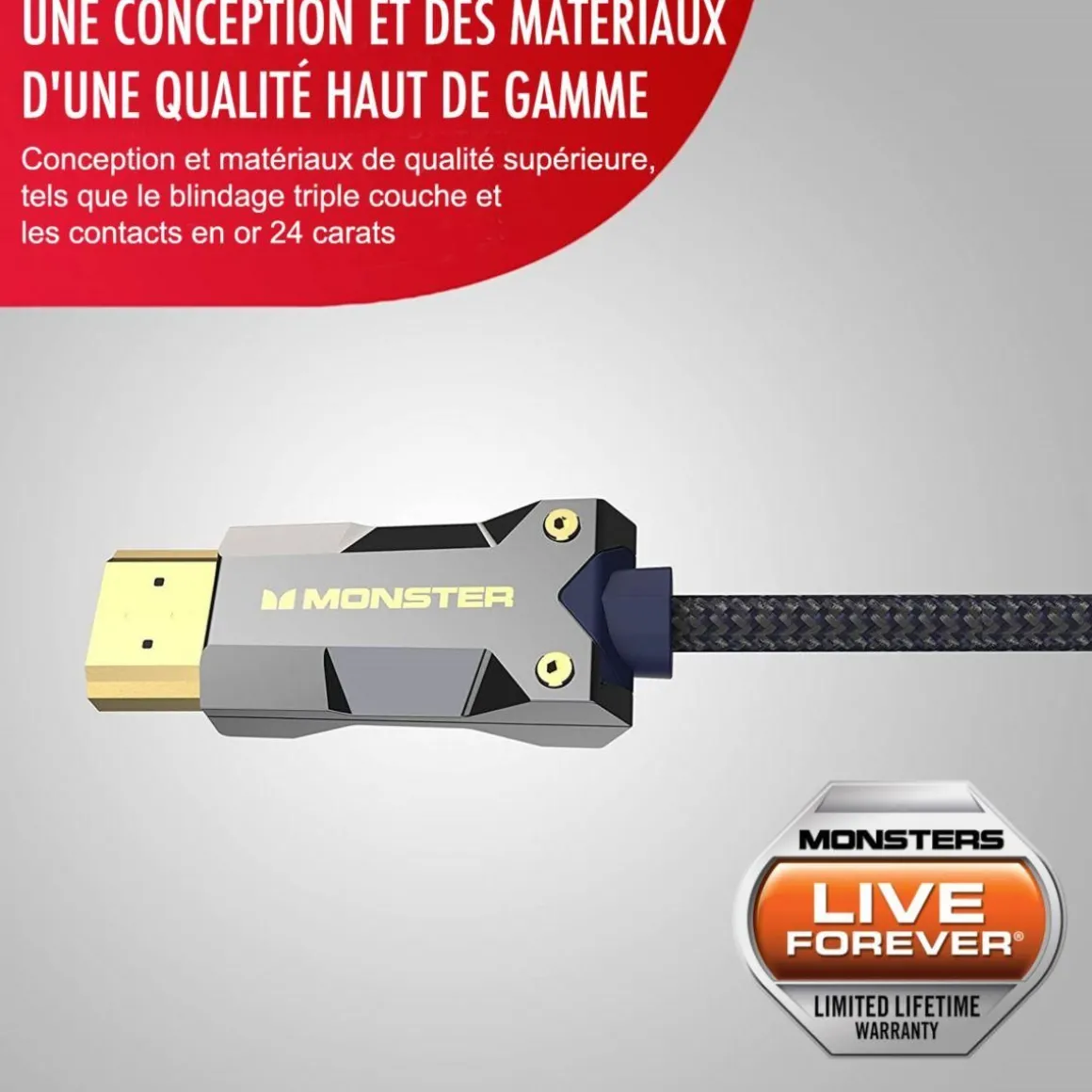 | Particularité(s) | Monster protège votre câble à vie. Cable For Life™ est exclusif à Monster. Si à l’avenir, vous achetez un téléviseur et une source qui dépassent les capacités de ce câble et qu’il cesse de fonctionner, Monster le remplacera gratuitement ! | |
