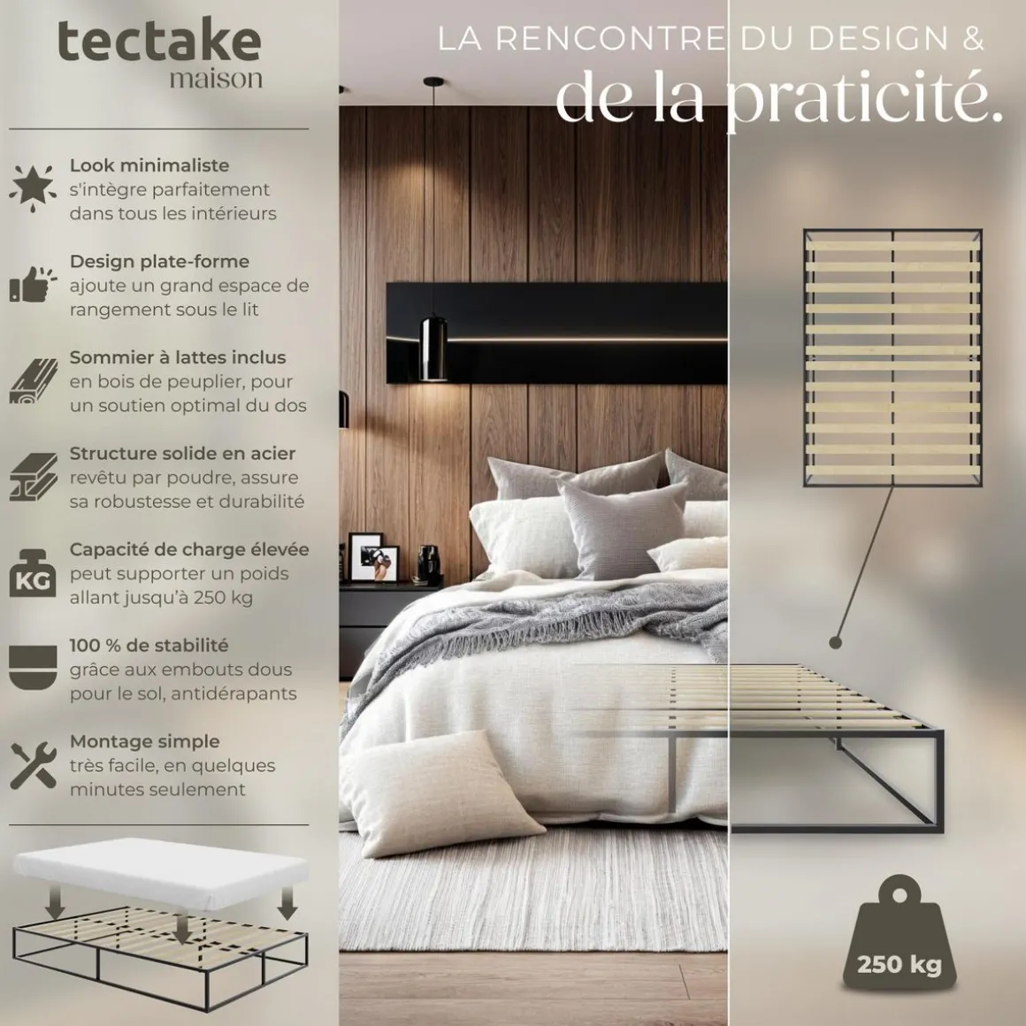 Le cadre de lit KYOTO de tectake apporte une touche moderne à votre chambre et assure des rêves doux. Avec ses lignes épurées et son style discret, il crée une atmosphère calme et harmonieuse et s’intègre parfaitement dans différents styles d’aménagement.