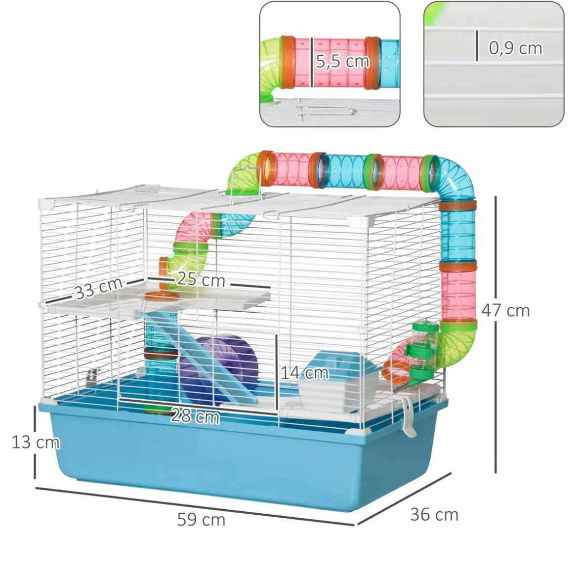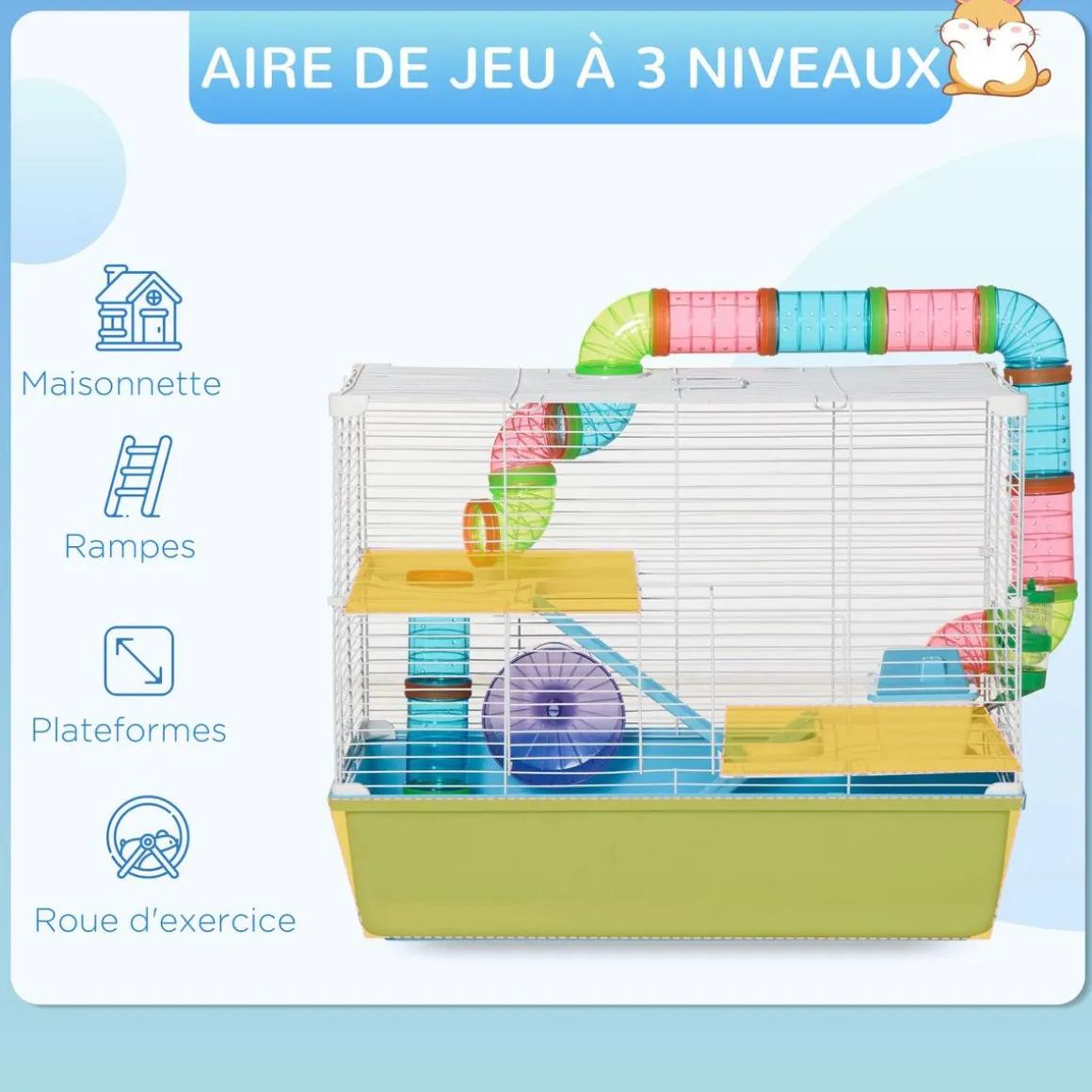 – Multi-équipement : tunnels, maisonnette, roue d’exercice, biberon d’eau, etc.