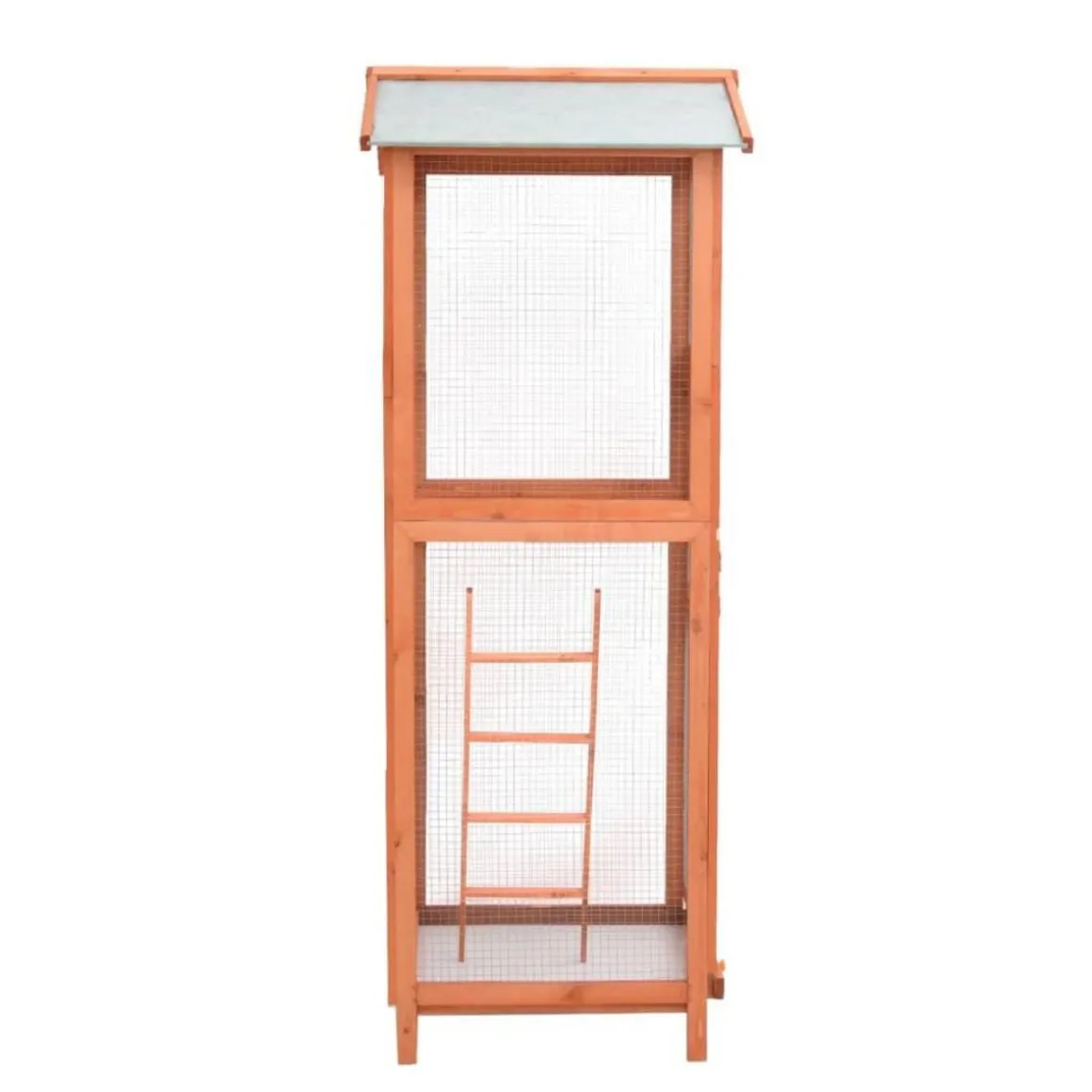 Avec un cadre en bois de sapin de haute qualite, la maison pour oiseaux est solide et durable. Le tissu resistant a l’eau sur le toit previent l’infiltration de la pluie. Une echelle permet aux oiseaux de monter et de descendre facilement. Le plateau coulissant en bas de la cage pour oiseaux facilite le nettoyage. La cage dispose de deux portes, la plus grande pour nettoyer et la petite pour nourrir. Les deux portes sont verrouillables avec des loquets coulissants.