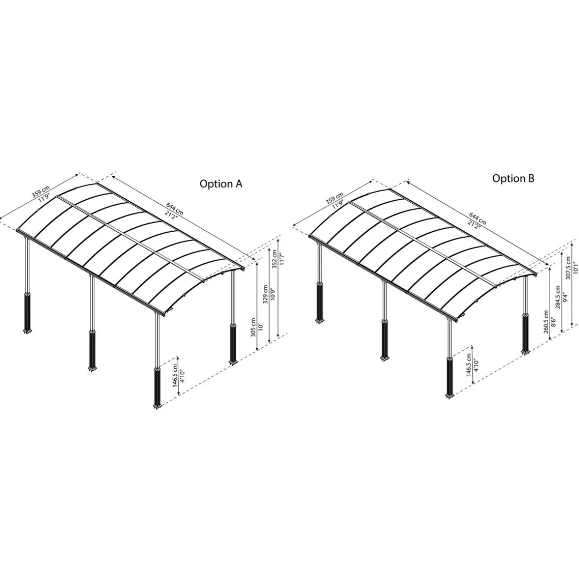 Ce carport Aracadia Alpine 6400 de 20,1 m² est idéal pour protéger des intempéries votre caravane, van ou véhicule haut. La hauteur du carport peut être ajuster entre 3,07 m et 3,52 m. Vous pouvez donc ajuster votre carport à vos besoins et à vos véhicules. Pratique donc, mais aussi esthétique, ce carport en aluminum assure embellissement de votre jardin sans entretien et naturellement anti-rouille.