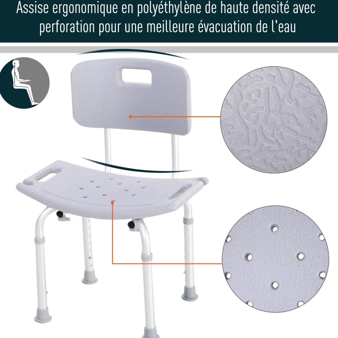 – Chaise de douche réglable en hauteur à 8 positions