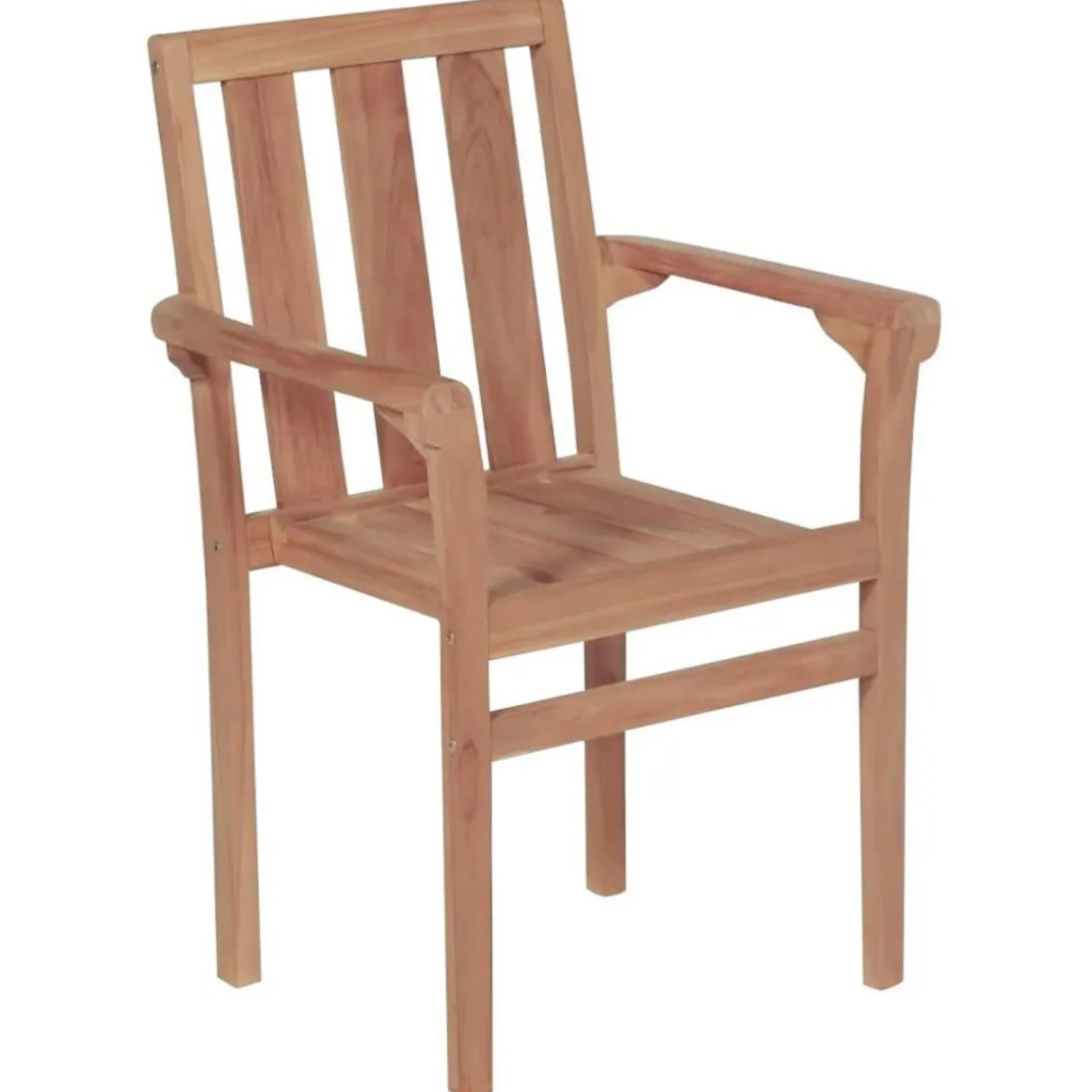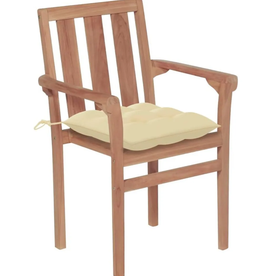 Fabrique en bois dur de teck extremement durable, cet ensemble de meubles en teck a ete chevronne, seche au four puis finement ponce pour lui donner un aspect tres lisse. Le bois de teck est connu pour sa resistance exceptionnelle aux intemperies, ce qui le rend bien plus adapte aux meubles de jardin que tout autre type de bois. Le bois de teck est le choix ideal si vous souhaitez acheter un meuble de jardin durable. Ces chaises sont empilables pour economiser de l’espace de rangement lorsqu’elles ne sont pas utilisees. Le produit est applique avec une belle finition pour donner au bois une couleur chaude. De plus, les coussins fournis offrent un confort supplementaire. Chaque coussin dispose de 2 ensembles de cordes pour les fixer fermement sur la chaise.