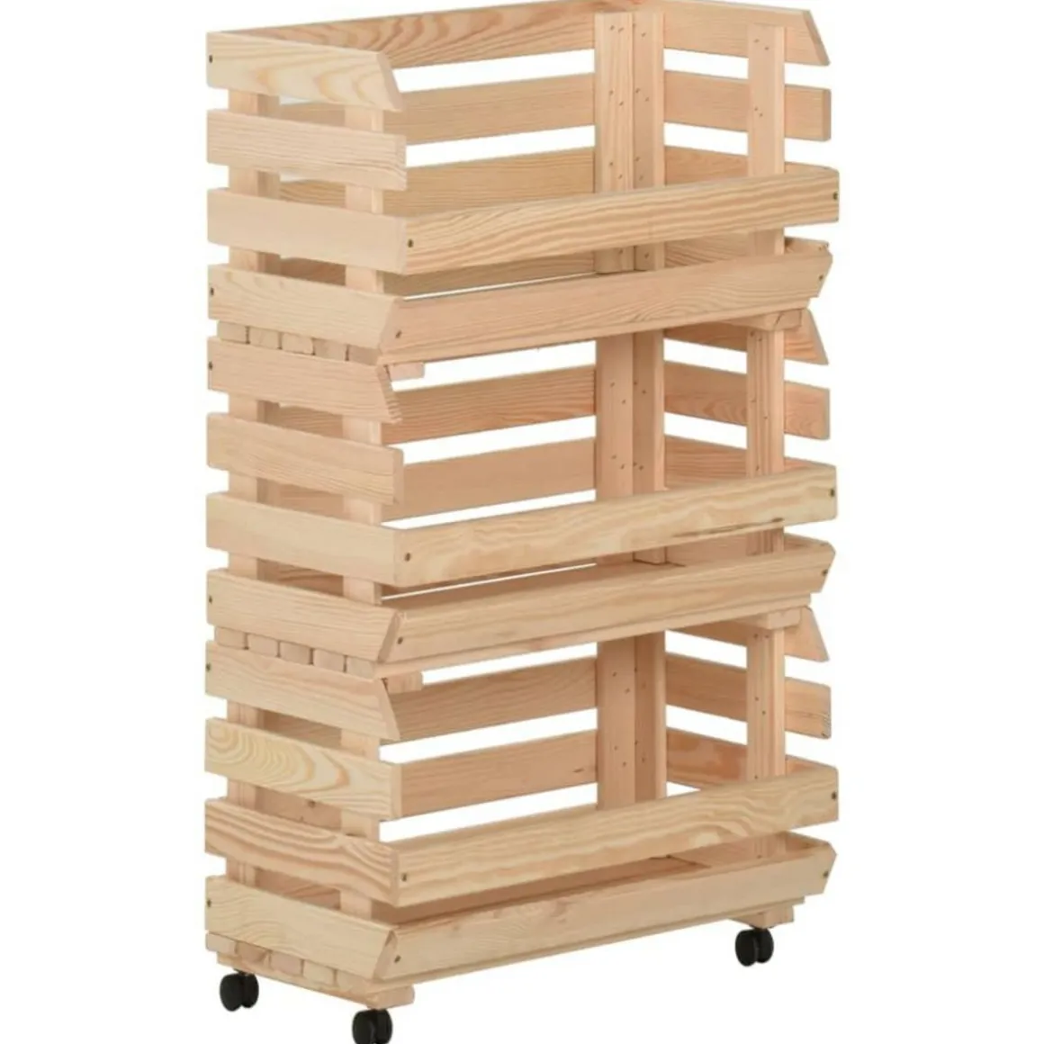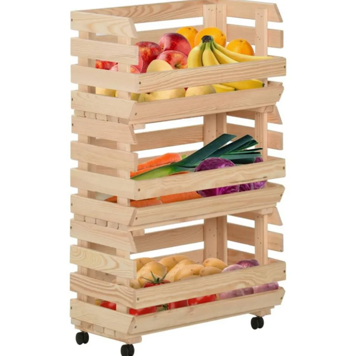 Cette boîte a fruits est fabriquee en pin massif, ce qui la rend stable et durable. Le chariot de rangement comprend 3 compartiments pour placer les aliments, les bouteilles et autres objets essentiels a portee de main. Grace a sa conception detachable, vous pouvez utiliser chaque etagere individuellement selon vos besoins. De plus, le chariot de cuisine est equipe de roues flexibles pour un deplacement facile.