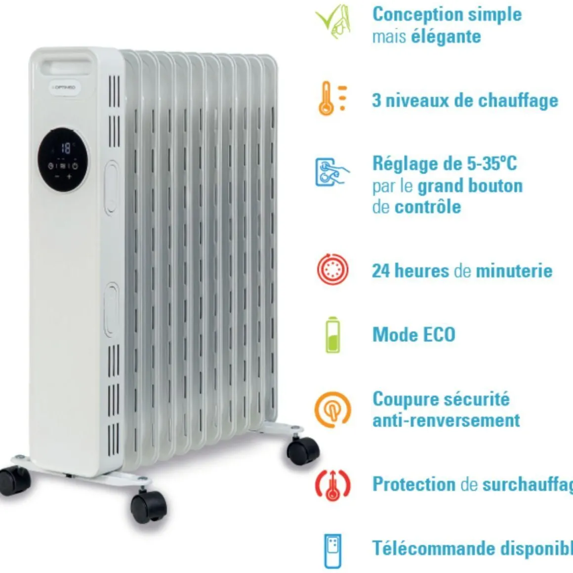 | Spécificités | 13 éléments, 3 Niveaux de chauffage 24 heures de minuterie (programmation de l’allumage ou de l’arrêt) Télécommande disponible avec 4 roulettes | |