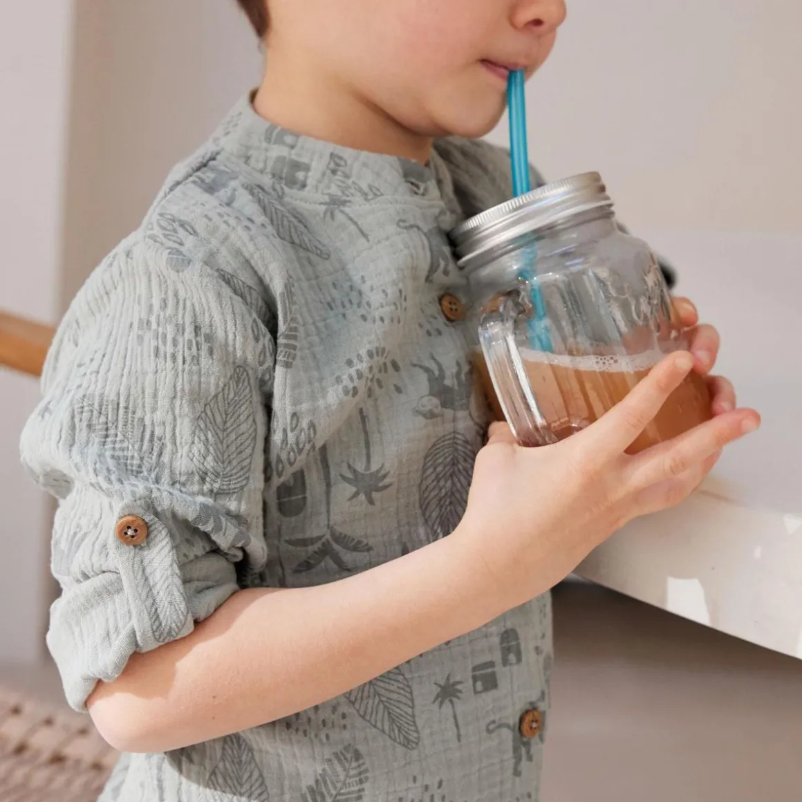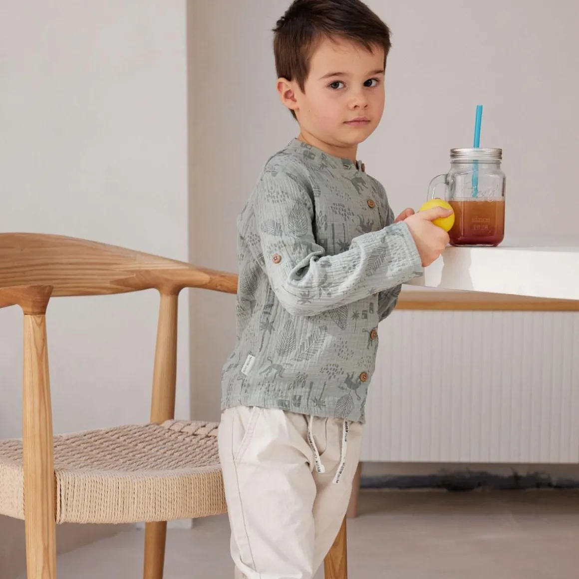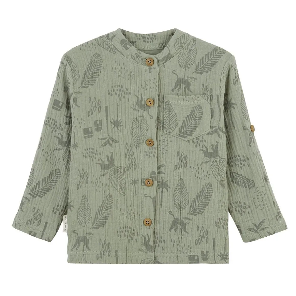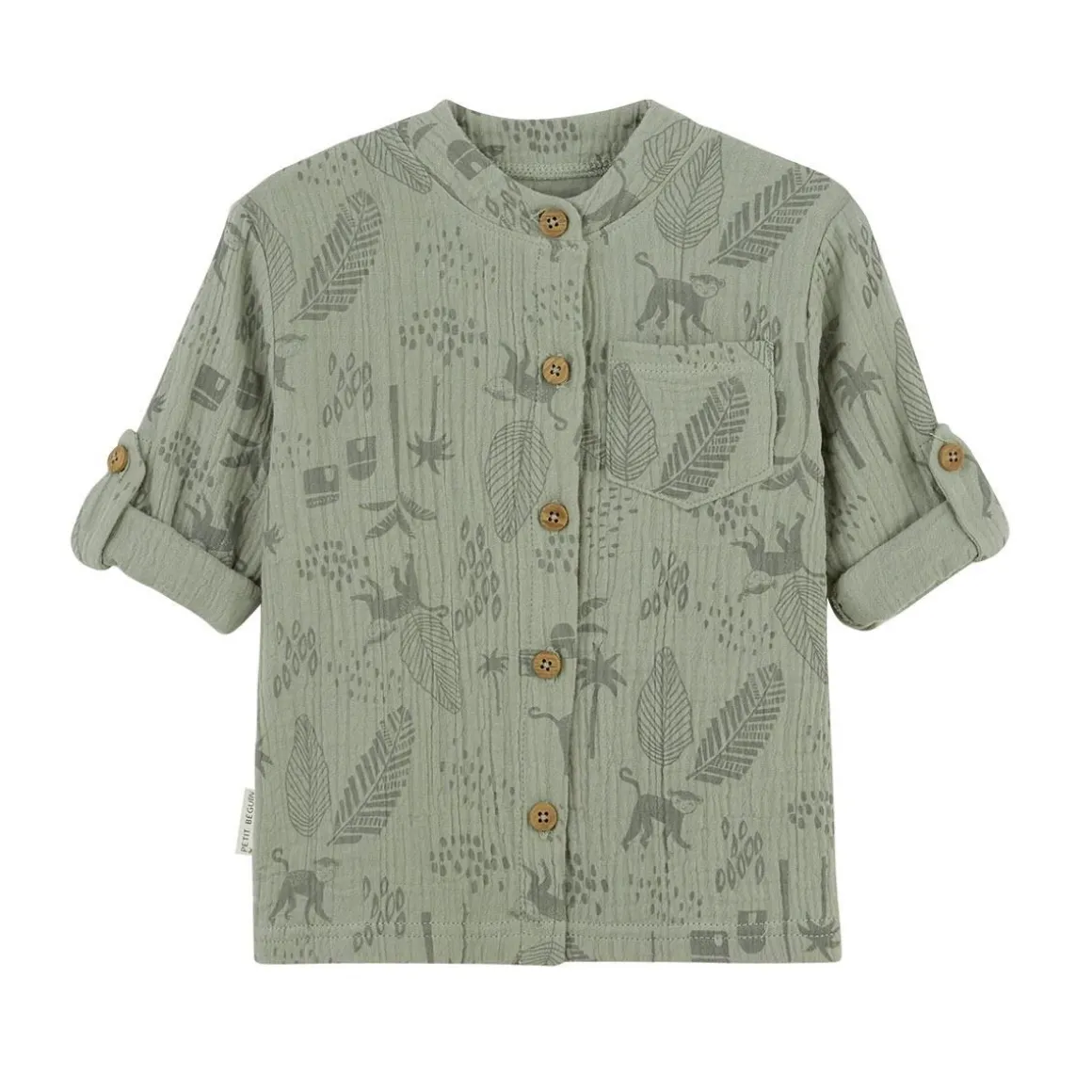 Soyez chic avec cette superbe chemise kaki en coton gaufré. On craque aussi pour son bel imprimé et son col mao ! Pratique, elle a aussi les manches retroussables, pour que votre garçon n’ait ni trop chaud, ni trop froid ! Produit labellisé STANDARD 100 by OEKO-TEX ® (BJ020 189402 TESTEX) Une ouverture complète sur l’avant On craque pour la matière gaze de coton super agréable Des manches retroussables
