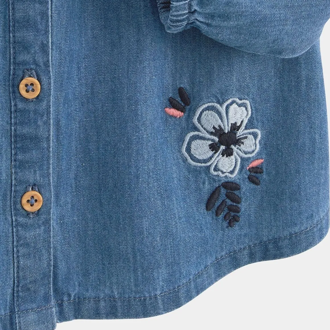 On revisite la altique veste en jean ! Craquez pour cette jolie chemise à manches longues avec ouverture boutonnée complète à l’avant. Le petit plus ? Les jolies fleurs bleues brodées, ses fronces et ses volants trop beaux sur les épaules ! Des volants qui nous font craquer Une ouverture complète sur le devant ! De jolies broderies