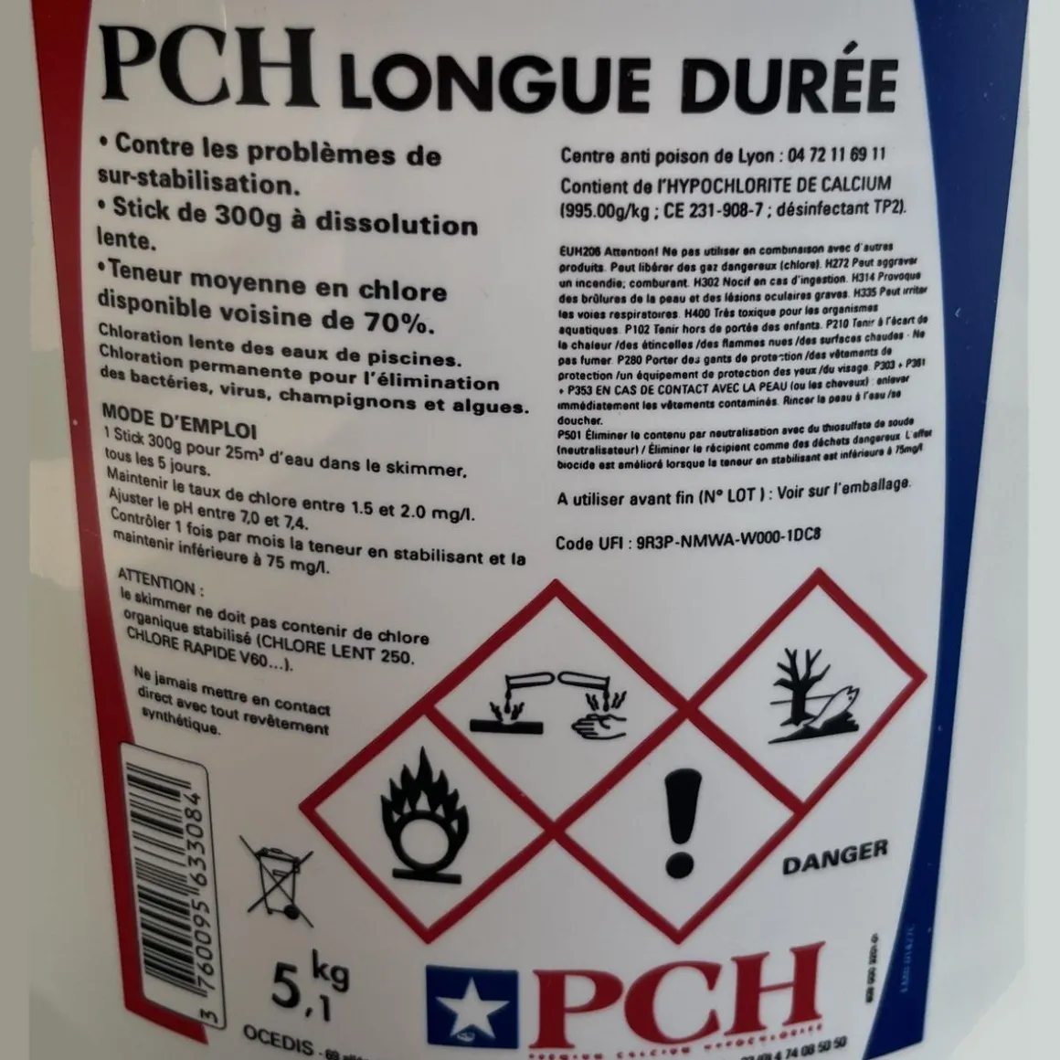 Conforme à l’EN 15796 : Produit chimique utilisé dans le traitement des eaux de piscines : Hypochlorite de calcium hydraté.