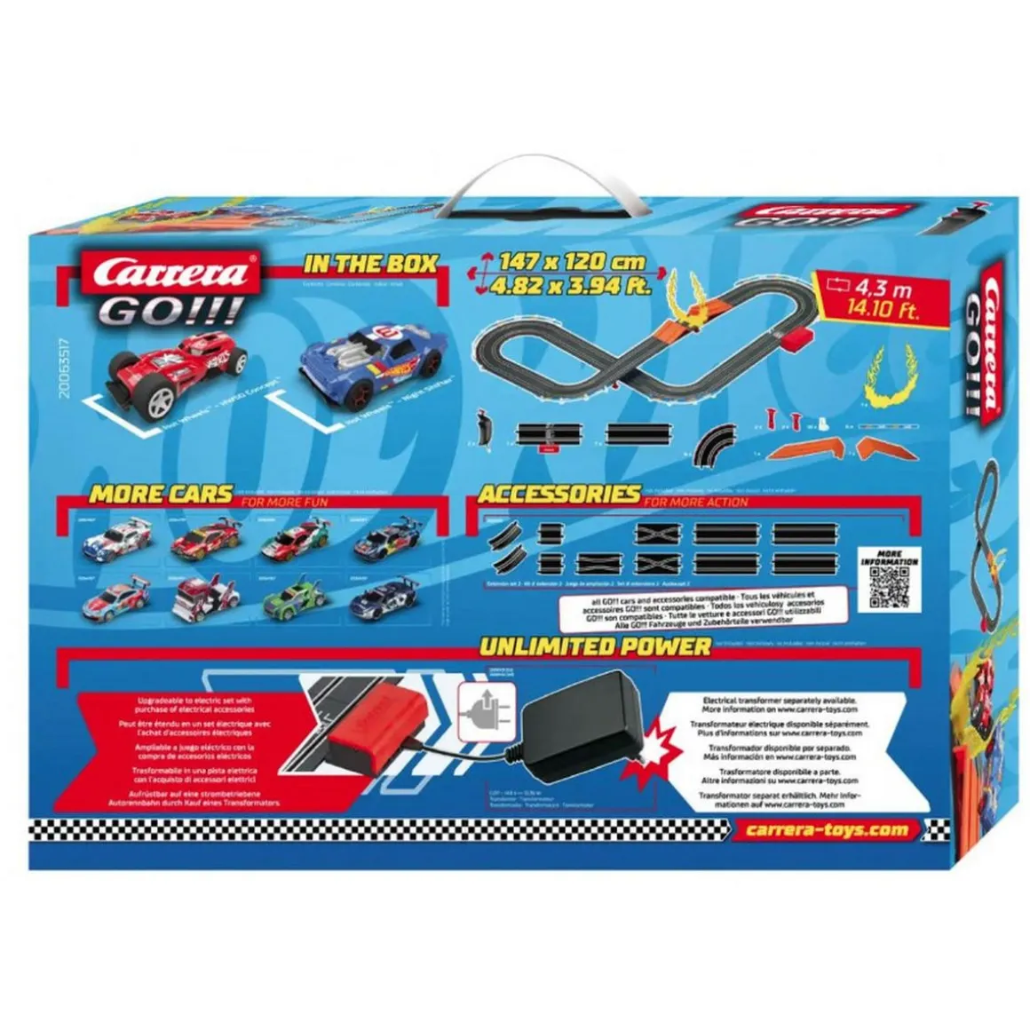 Deux pilotes en herbe peuvent s’affronter sur les circuits Carrera GO!!!. La vitesse est importante, mais l’habilité compte aussi puisqu’on peut personnaliser son circuit avec des bosses, des sauts, loopings et d’autres éléments. Ce type de circuit est aussi très amusant pour les adultes qui pourront ainsi partager une activité avec leurs enfants.Les circuits Carrera GO!!! sont généralement vendues avec deux voitures. Cependant, il est possible de renouveler l’expérience de jeu et de collectionner de nombreuses voitures puisque que Carrera propose une offre complète de petits bolides. Le circuit est aussi complètement personnalisable : en plus des rails, looping et bosses, on peut aussi modifier le décor (bordures, mâts, drapeaux, etc. Tous ces éléments sont disponibles en option.