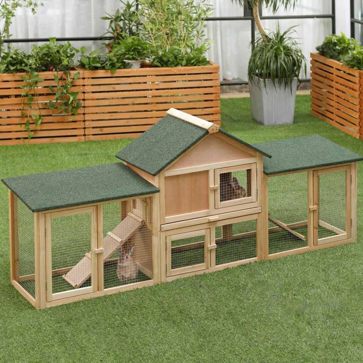 – Offrez un grand espace de vie pour le plus grand confort de vos lapins : espace fermé à l’étage pour être à l’abri de la pluie, du vent, de l’humidité + 2 aires de jeu spacieuses grillâgées avec rampes d’accès niveau supérieur