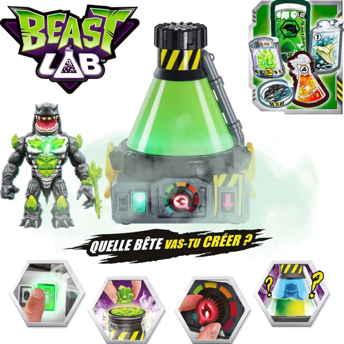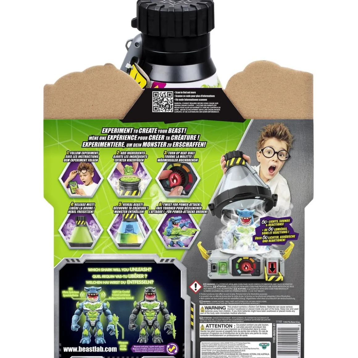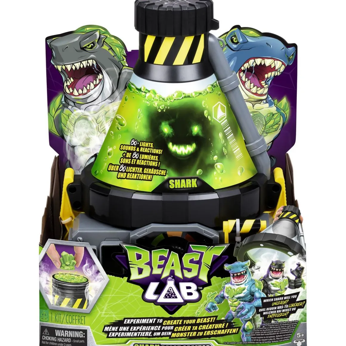 Plonge dans l’expérience avec le créateur de monstres et donne vie à un requin étonnant ! Quel requin découvriras-tu ? S’agit-il du redoutable Havoc Hammerhead ou bien du redoutable Mayhem Megashark ? Le Beast Lab est équipé de plus de 80 effets lumineux et sonores pour animer chacune de tes expériences. Une mission d’une importance capitale repose désormais sur tes épaules !