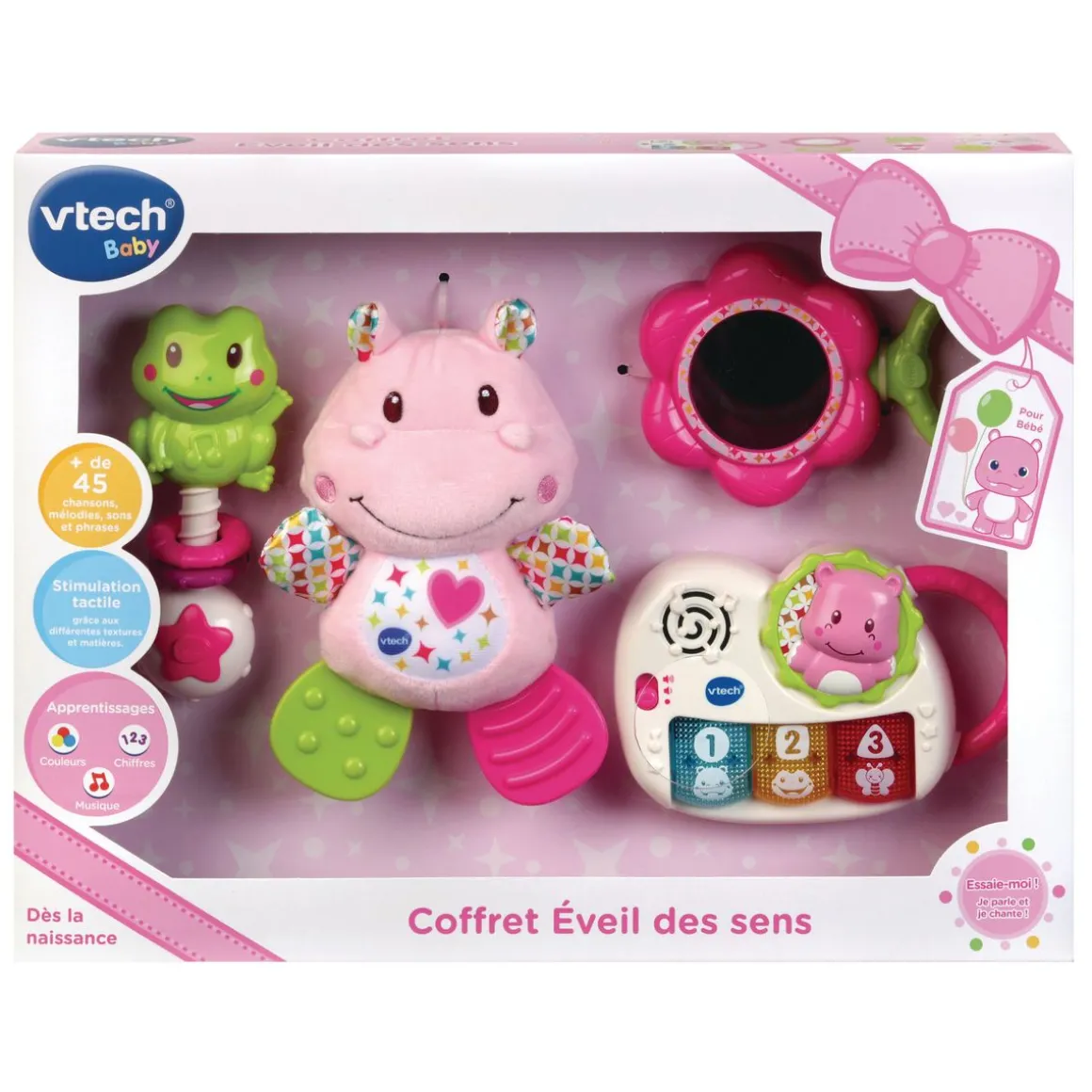 Le coffret naissance « éveil des sens » est le coffret idéal pour accompagner les premiers pas de votre enfant dans le développement de son éveil. Ce coffret comporte plusieurs éléments pour émerveiller bébé : – Un hippo en peluche tout doux avec différentes textures et des pattes en plastique souple pour apaiser les poussées dentaires ; – Un hochet grenouille qui développe le toucher et stimule la motricité ; – Un miroir en forme de fleur pour encourager la découverte de soi ; – Un piano avec avec sons et lumières pour stimuler la motricité et l’ouïe en douceur. Grâce au packaging très travaillé, le coffret éveil des sens est le cadeau de naissance idéal à offrir !