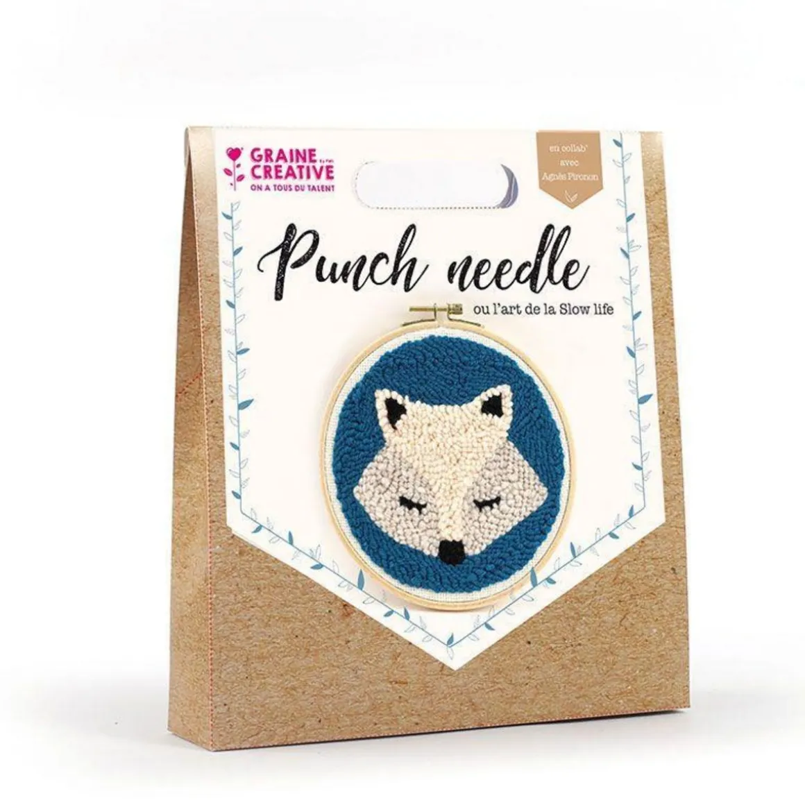 Coffret Punch Needle – Renard – 20 cm Le Punch Needle est une technique de broderie en relief réalisé grâce à un poinçon. En piquant la toile, on obtient de petites boucles de laine qui forment un motif. Le kit Punch Needle Renard contient : – 1 aiguille, – 1 tambour en forme de cercle Ø 20 cm, – 1 toile, – 4 couleurs de laine : beige, bleu marine, gris et noir. Prix de l’Innovation, catégorie ‘Kit de l’année’ du salon Creativeworld 2019.