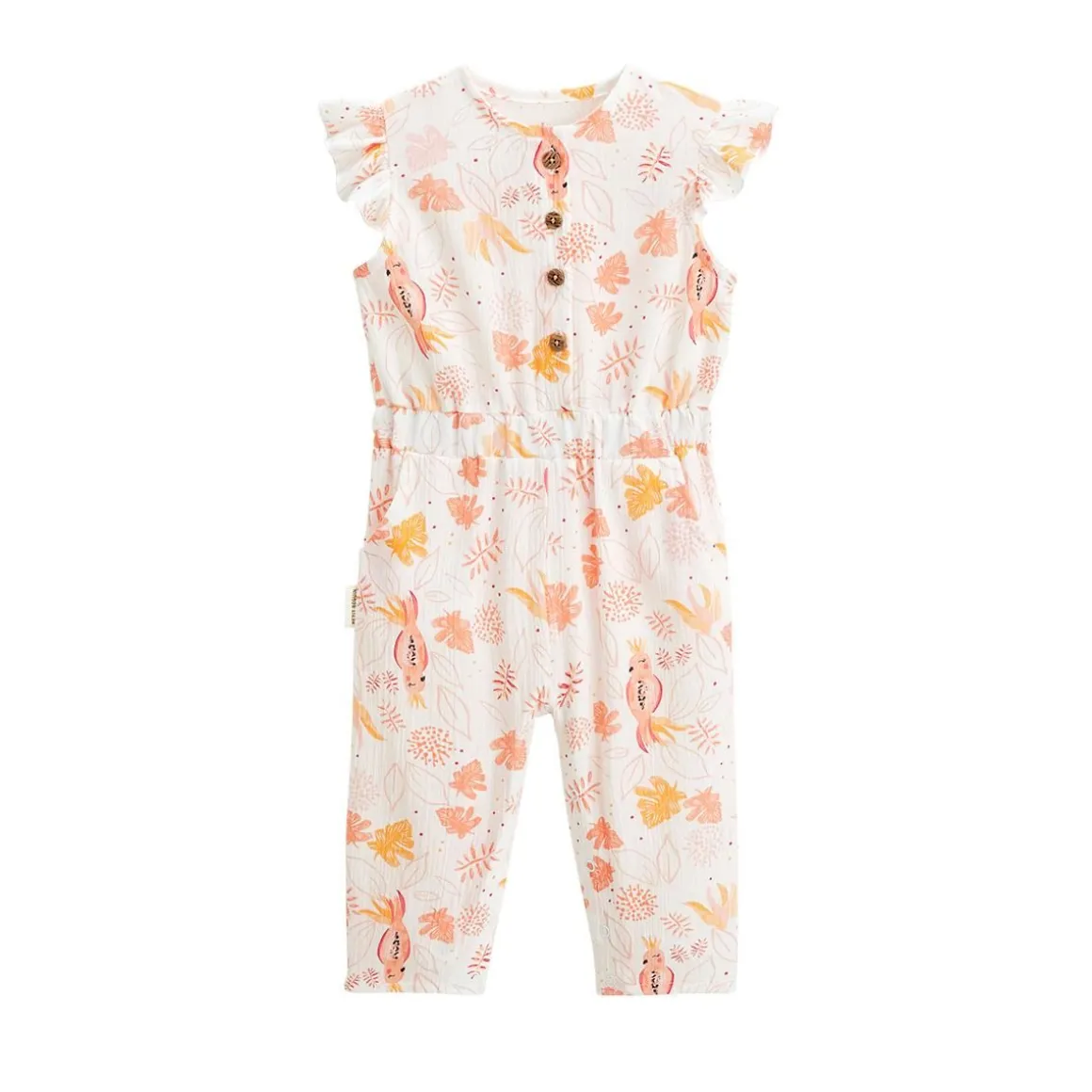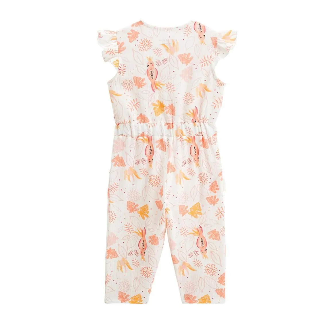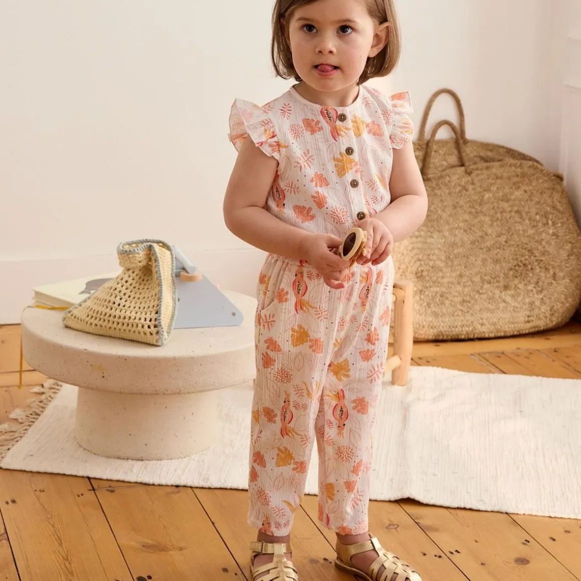 Voici notre combinaison pantalon, parfaite pour les journées ensoleillées ! Son tissu en coton gaufré tout doux et sa coupe fluide offrent confort et légèreté. On craque pour ses jolis motifs fleuris et ses volants qui ajoutent une touche tendance. Un must-have pour que votre petite fille profite de l’été avec style et confort. De jolis volants aux épaules Ouverture par pressions à l’entrejambe et des boutons effet bois sur le haut Des vraies poches trop pratique Produit labellisé STANDARD 100 by OEKO-TEX ® (BJ020 189402 TESTEX)
