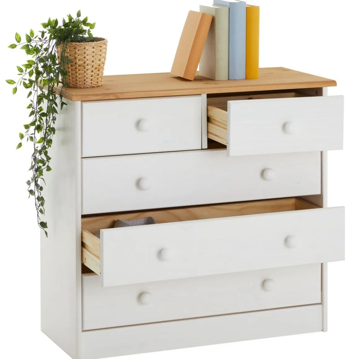 … dispose de 5 tiroirs de rangement, à savoir 3 grands et de 2 petits tiroirs sur rails plastiques, qui vous permettront de ranger de nombreuses affaires, ainsi que du linge ou des vêtements. Celle-ci sera parfaite dans votre chambre ou bien dans celle de vos enfants. De plus, ce meuble de rangement au design simple et passe-partout est disponible dans divers coloris pour que vous puissiez facilement l’associer à votre mobilier déjà existant. Retrouvez la collection complète de meubles en pin Rondo dans notre boutique !