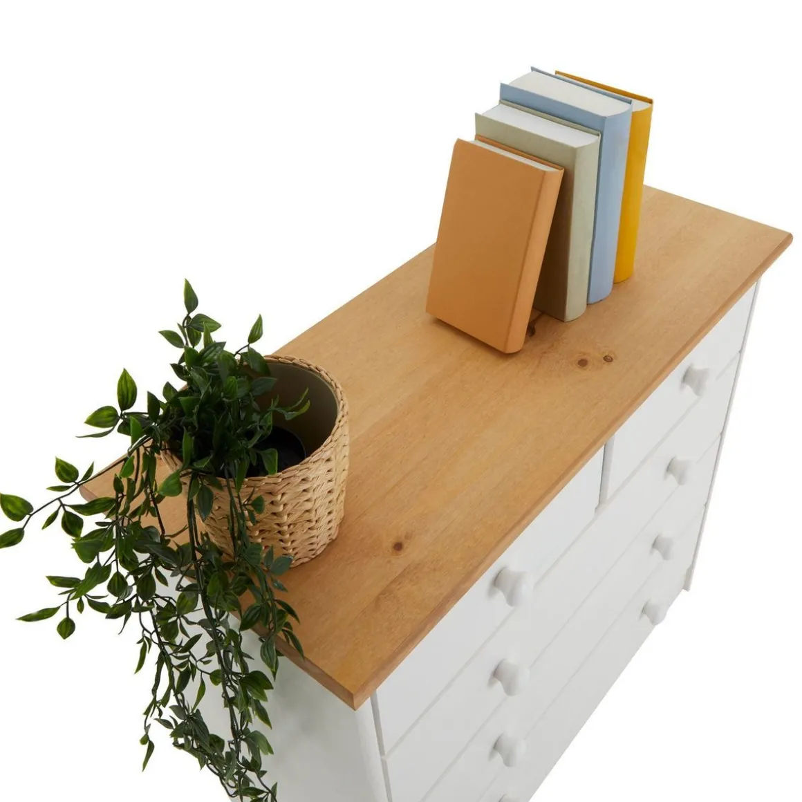 – La commode est fabriquée en pin massif et lasurée en blanc et brun.