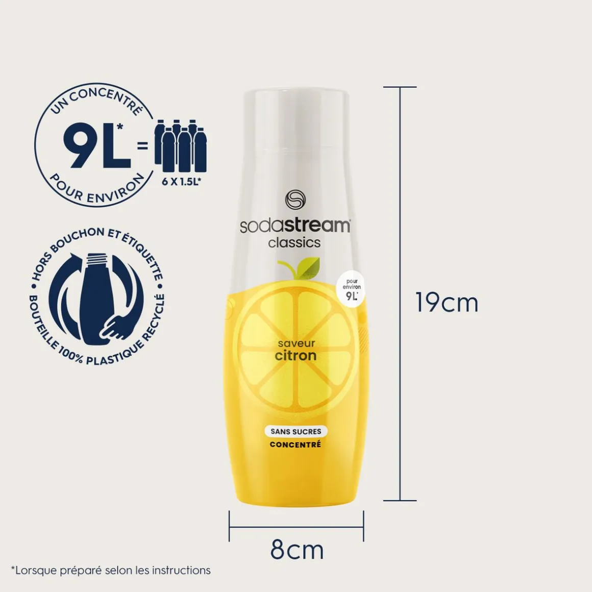 | Dosage | 1 bouchon doseur = 1 bouteille de soda. Le meilleur dosage reste le vôtre. A titre indicatif le bouchon présente 3 traits à l’intérieur (le 1er trait pour 1 verre, le 2ème pour 0,5 l et le troisième pour 1 l | |