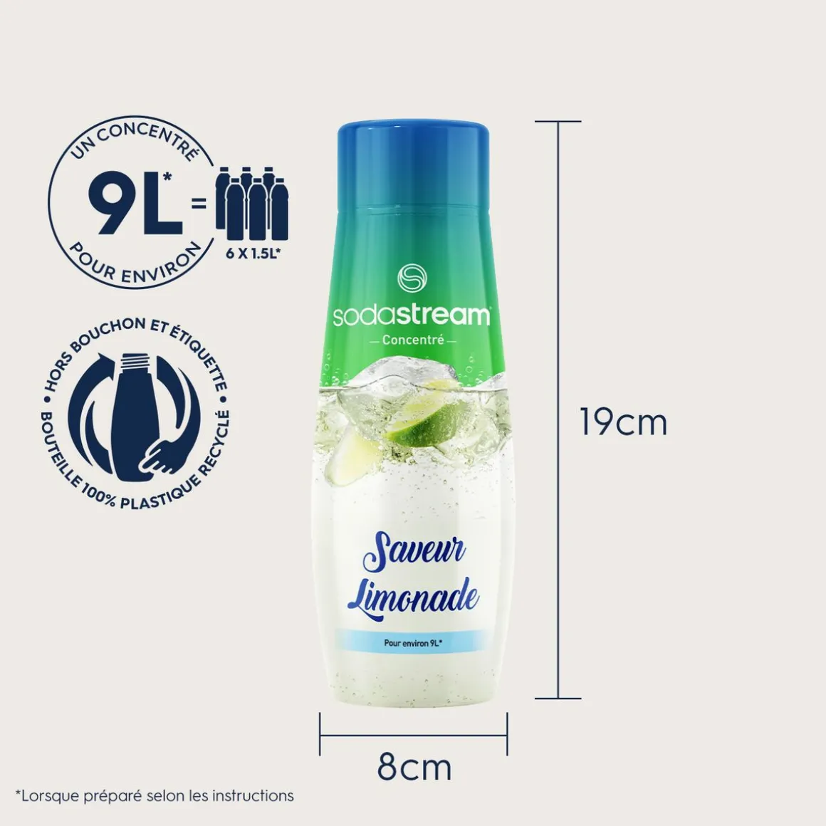 | Dosage | 1 bouchon doseur = 1 bouteille de soda. Le meilleur dosage reste le vôtre. A titre indicatif le bouchon présente 3 traits à l’intérieur (le 1er trait pour 1 verre, le 2ème pour 0,5 l et le troisième pour 1 l | |